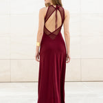 Vestido de invitada granate con escote halter y las delicadas piezas de tul en el cuello. Su espalda abierta le da un toque romántico y sutil.