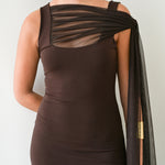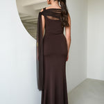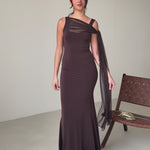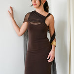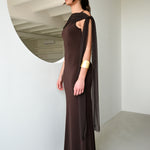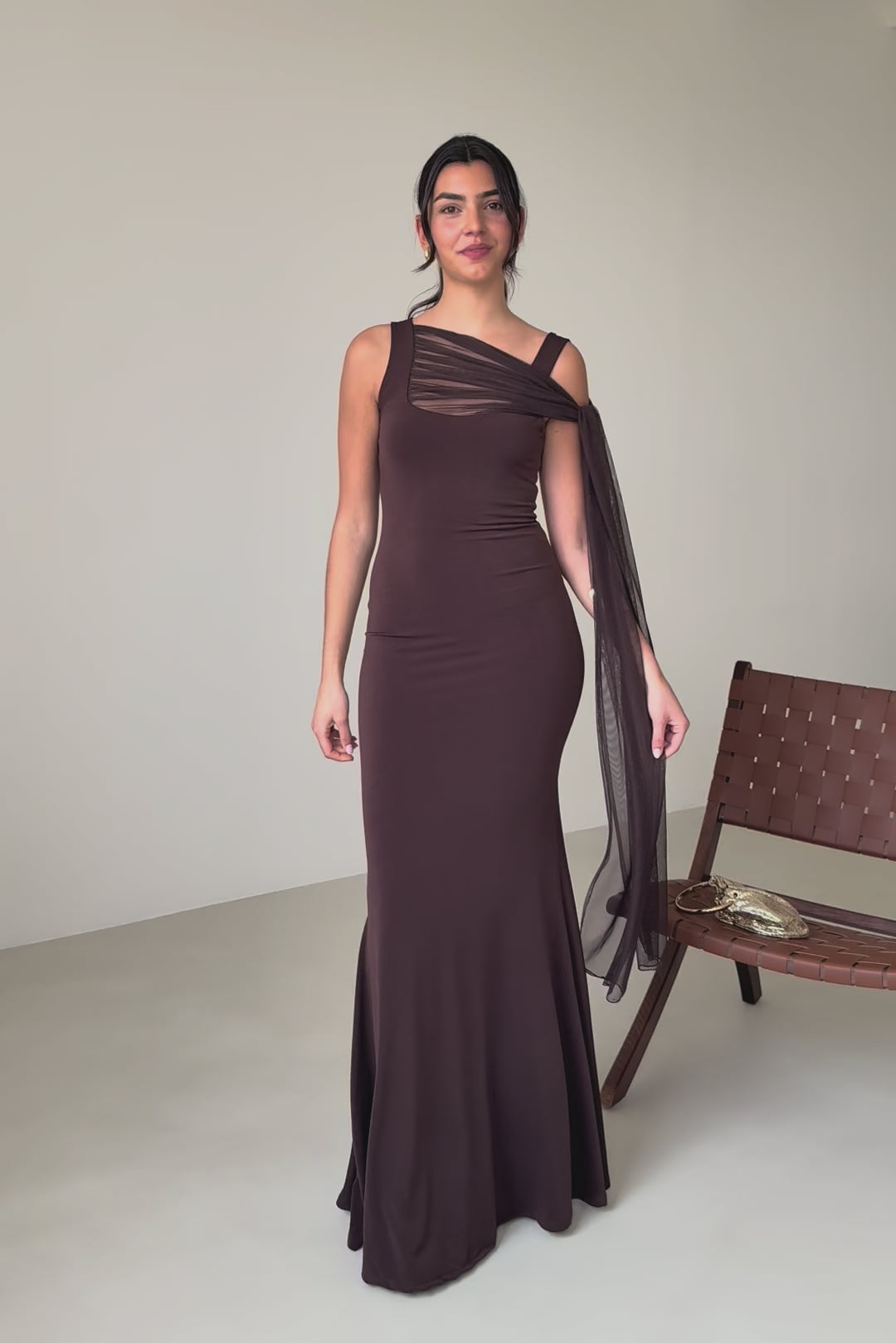 Un vestido largo que estiliza muchísimo y tiene ese detalle especial que lo hace diferente: el tul drapeado en el escote que cae desde el hombro creando un efecto capa súper elegante.