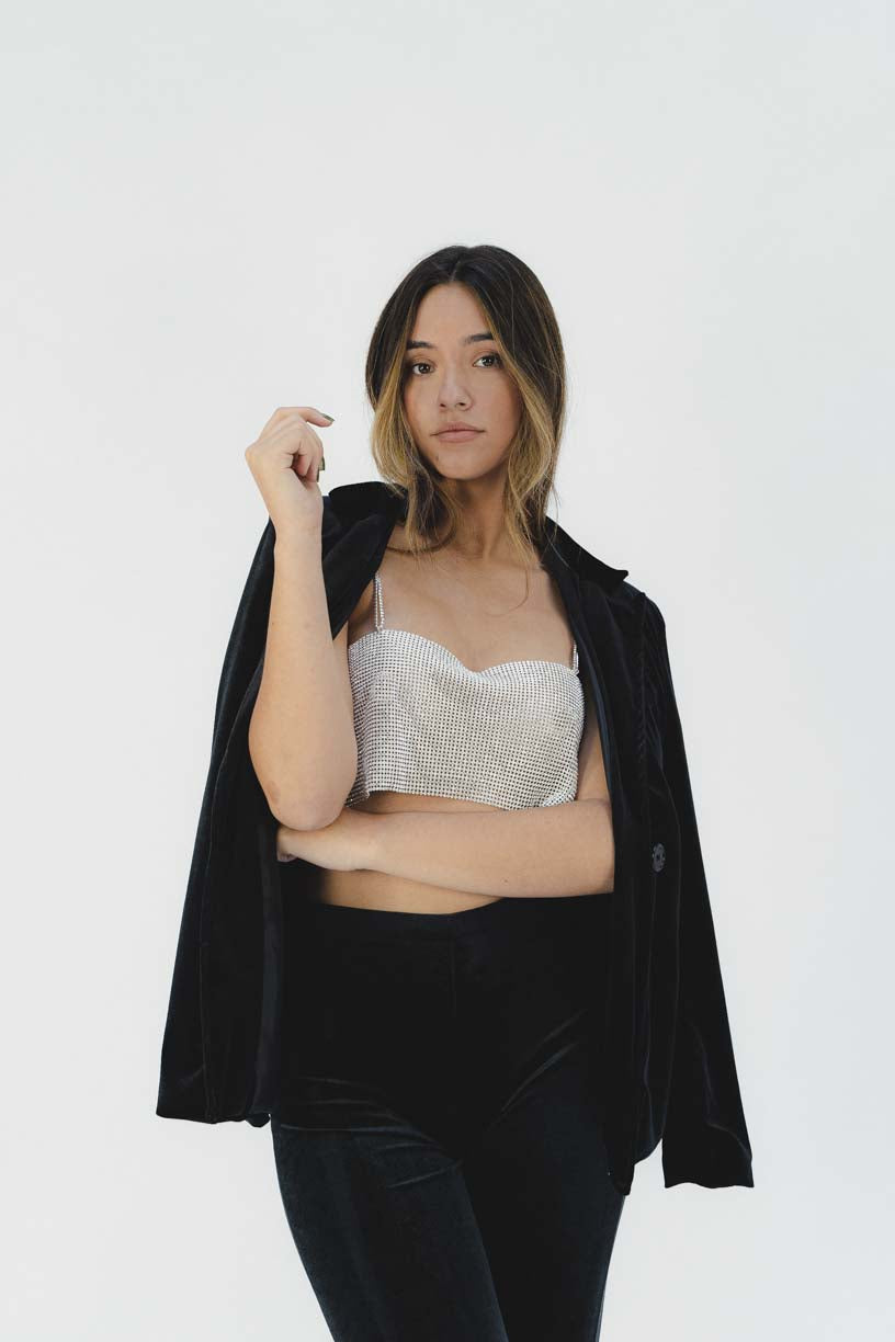 Croptop de tirantes en malla con brillantes incrustados, atado a la espalda.