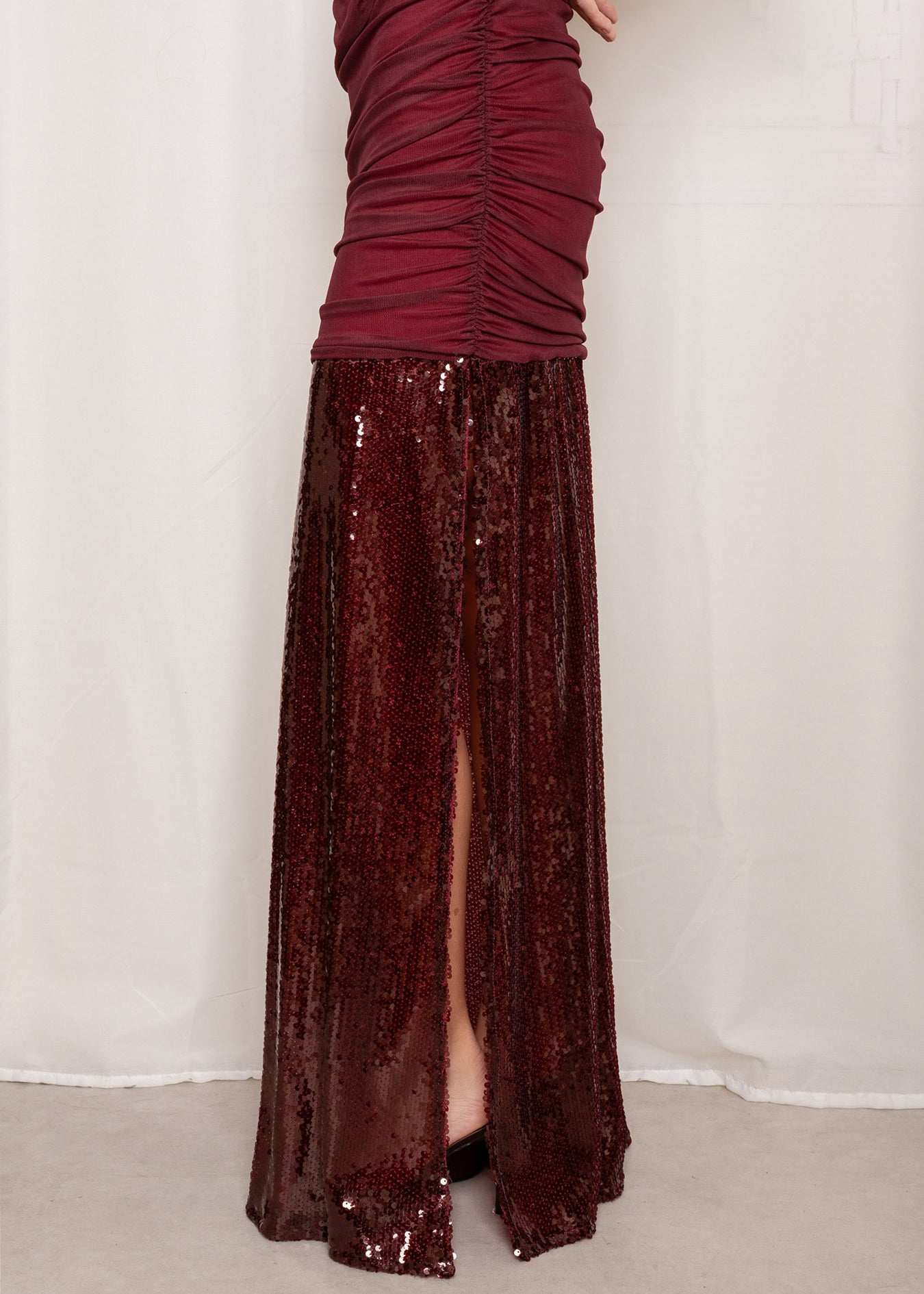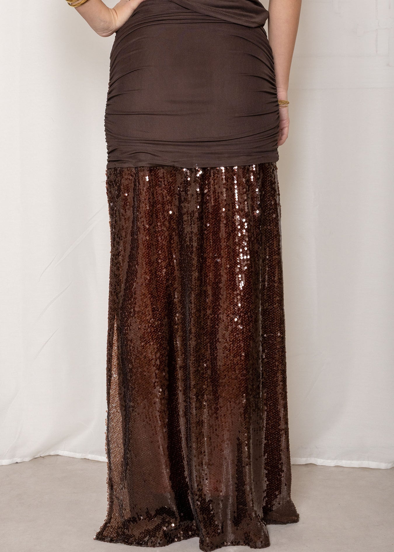 Modelo posando con Vestido asimétrico corto en color cobre brillante. Combinado con pantalones satinados negros.
