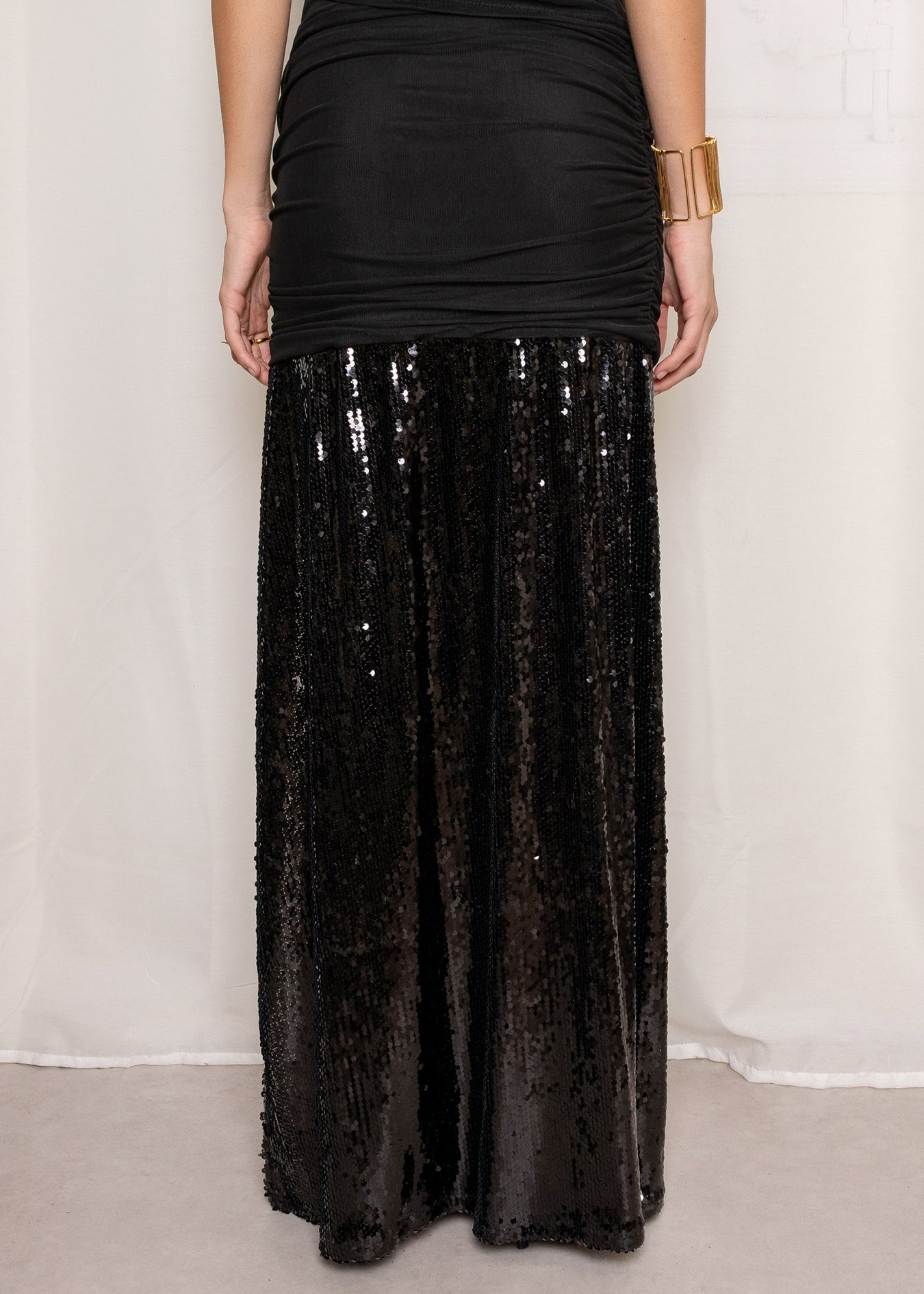 Modelo con top negro asimétrico combinado con mini short de lentejuelas negras