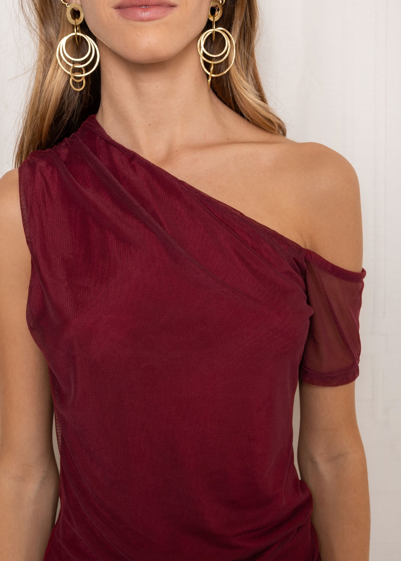Vestido cobre asimétrico con espalda abierta y lazada en modelo mujer