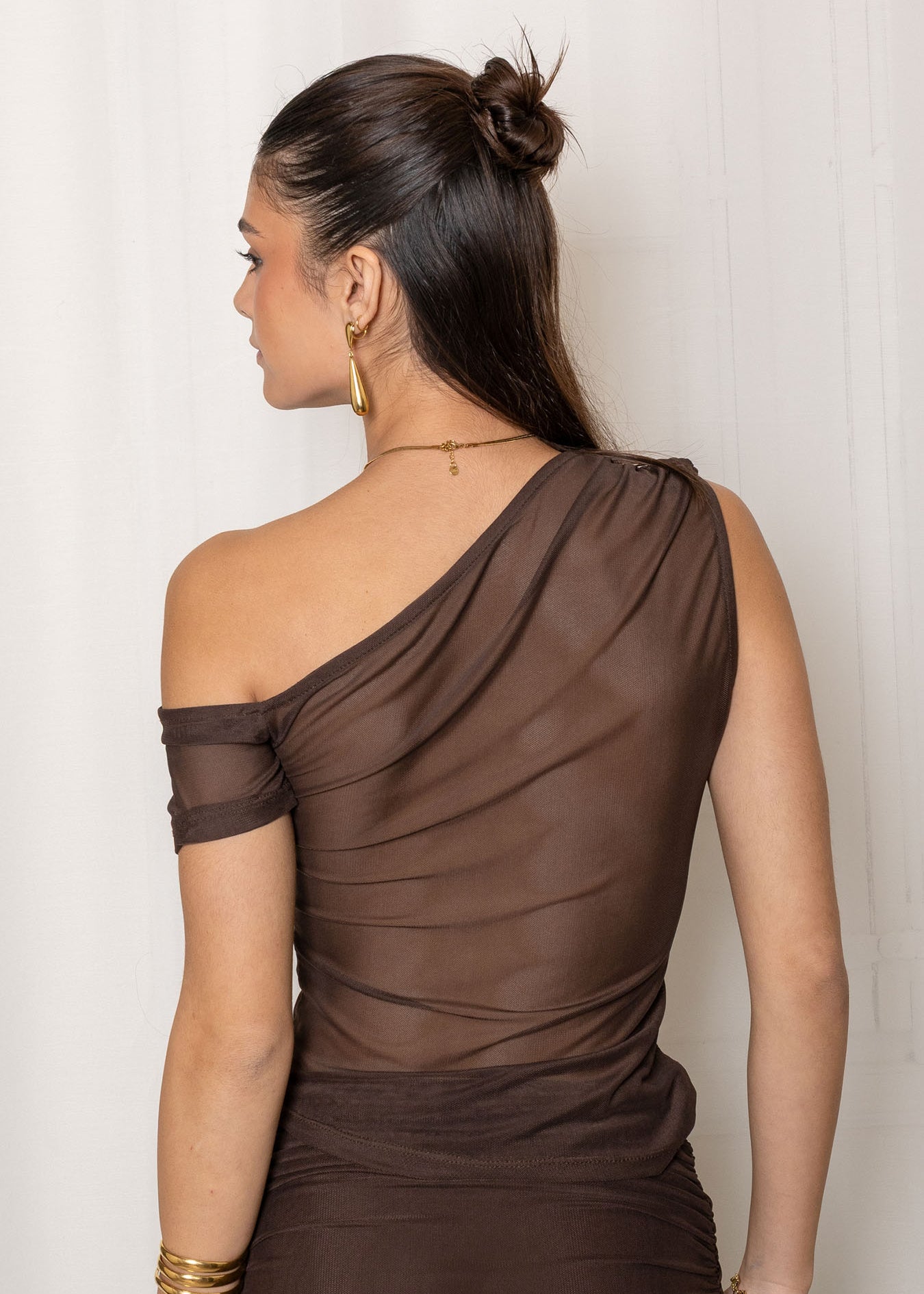 Modelo posando con Vestido asimétrico corto en color cobre brillante.
