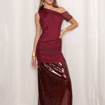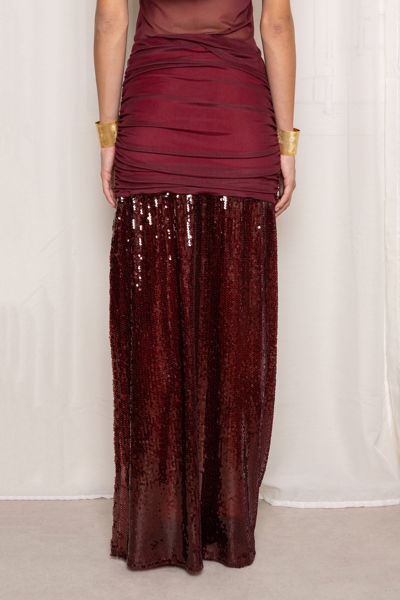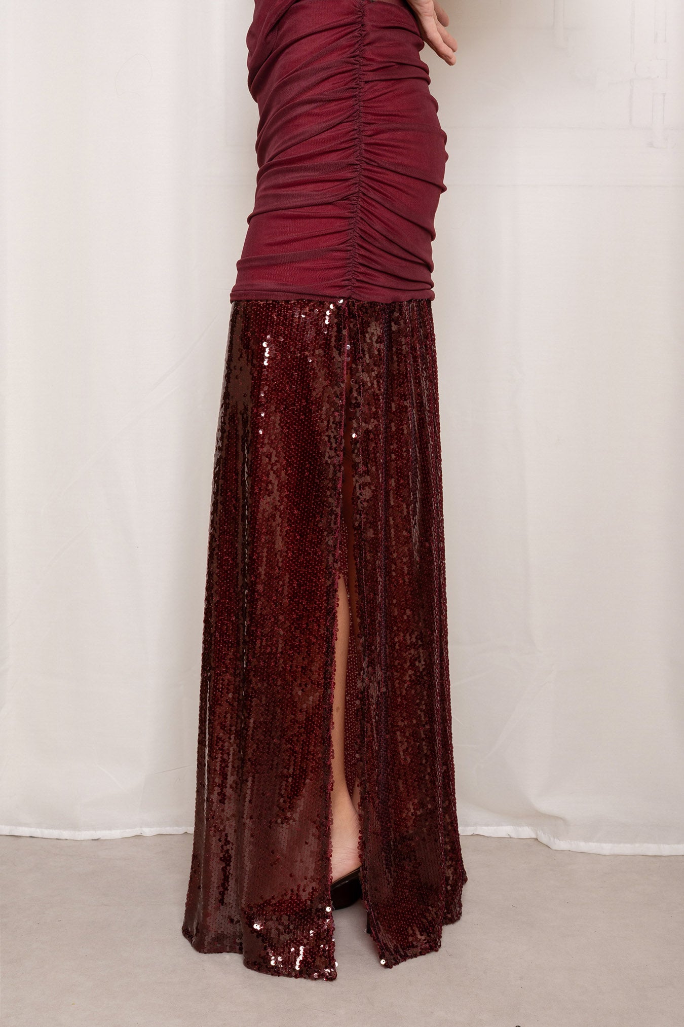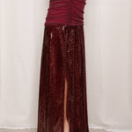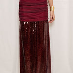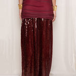 Falda larga color granate. Diseño de tiro alto con fruncido en el cuerpo, bajo cubierto de lentejuelas brillantes y abertura lateral .