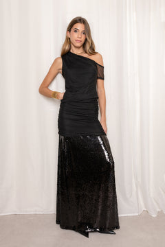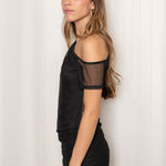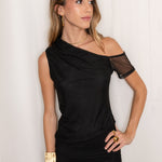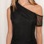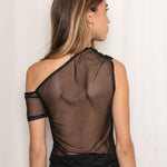 Top negro. Diseño de un solo hombro con escote asimétrico y manga corta tipo tul. Tejido de malla semitransparente con fruncido por delante y transparente por detrás.