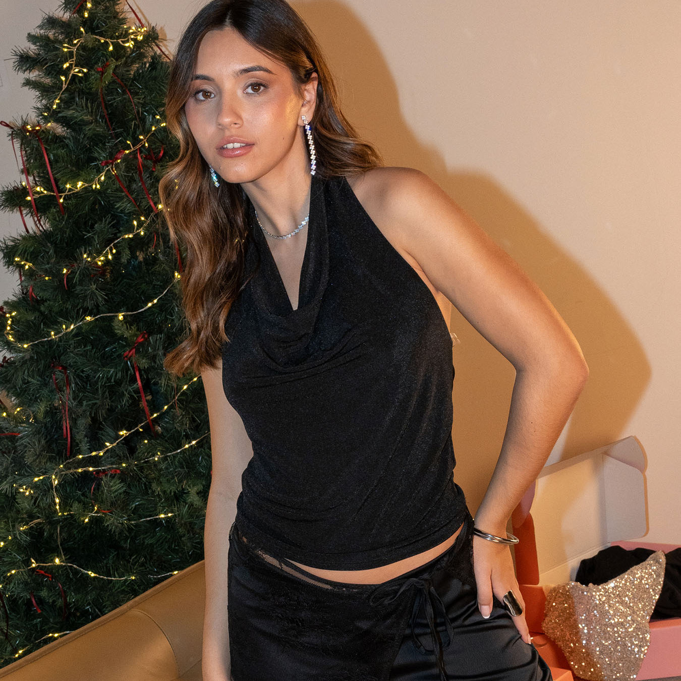 El Top Reef Negro es ese básico sofisticado que transforma cualquier look gracias a su diseño elegante y su sutil acabado brillante. Con un escote drapeado súper favorecedor y un corte halter que estiliza al instante, este top se convierte en la opción perfecta para elevar tus outfits de noche sin renunciar a la comodidad.