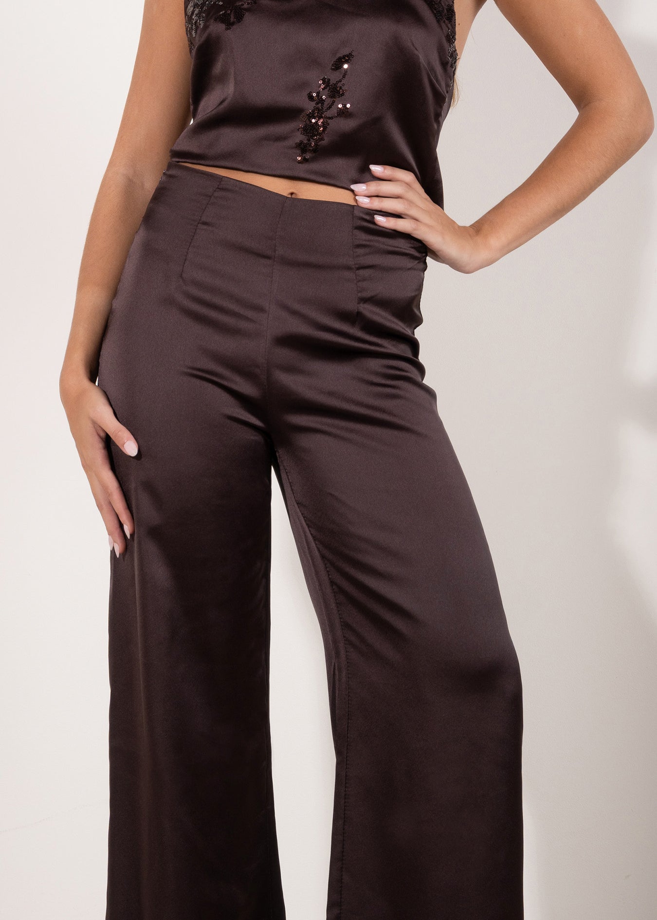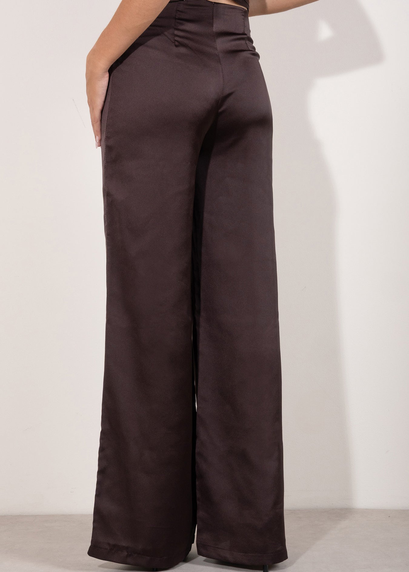Pantalón largo fluido de tul marrón chocolate con corte ancho y semitransparente