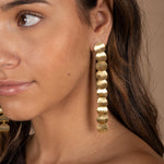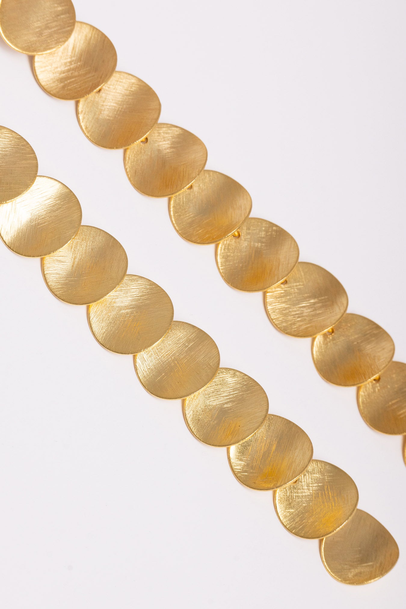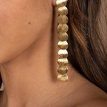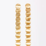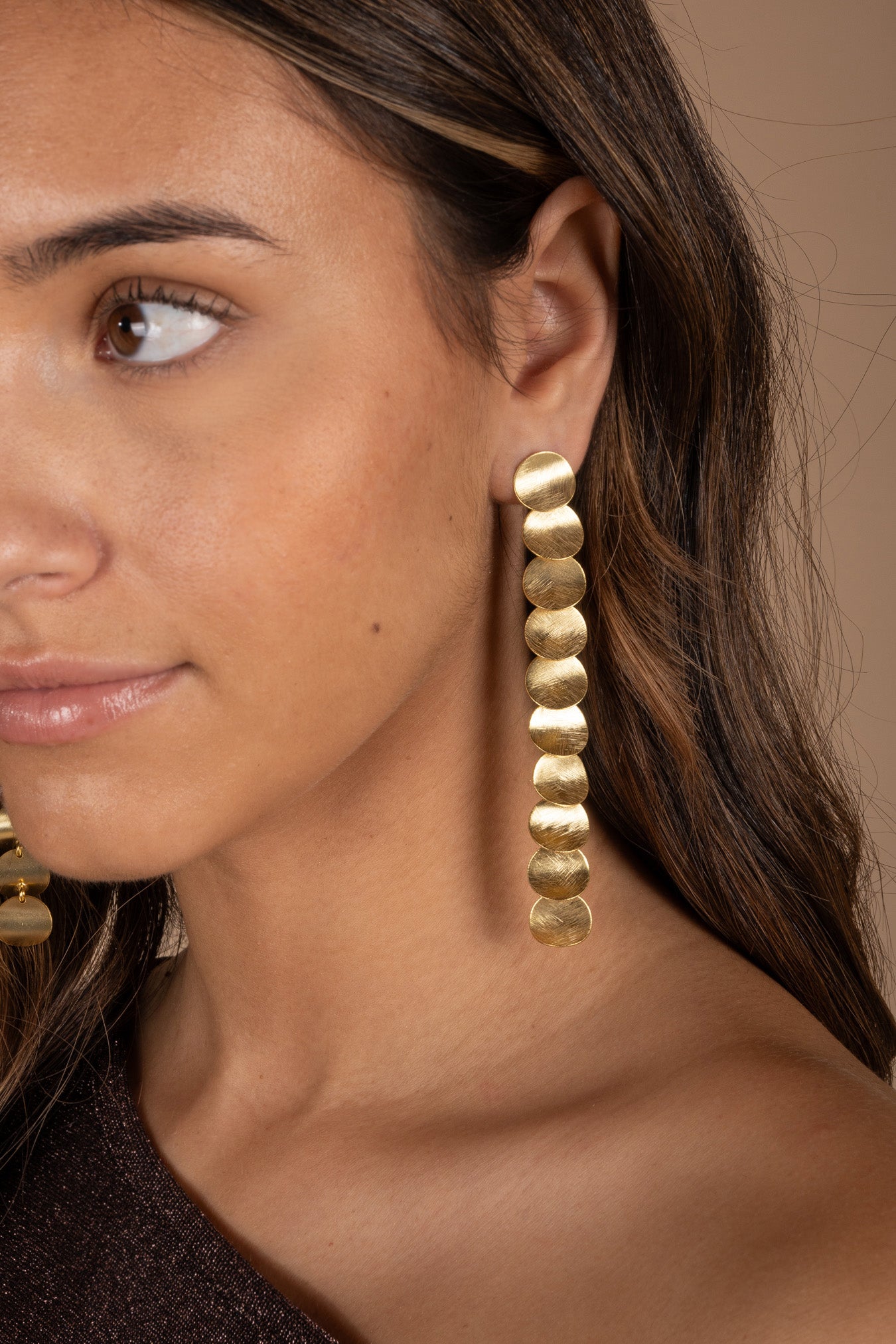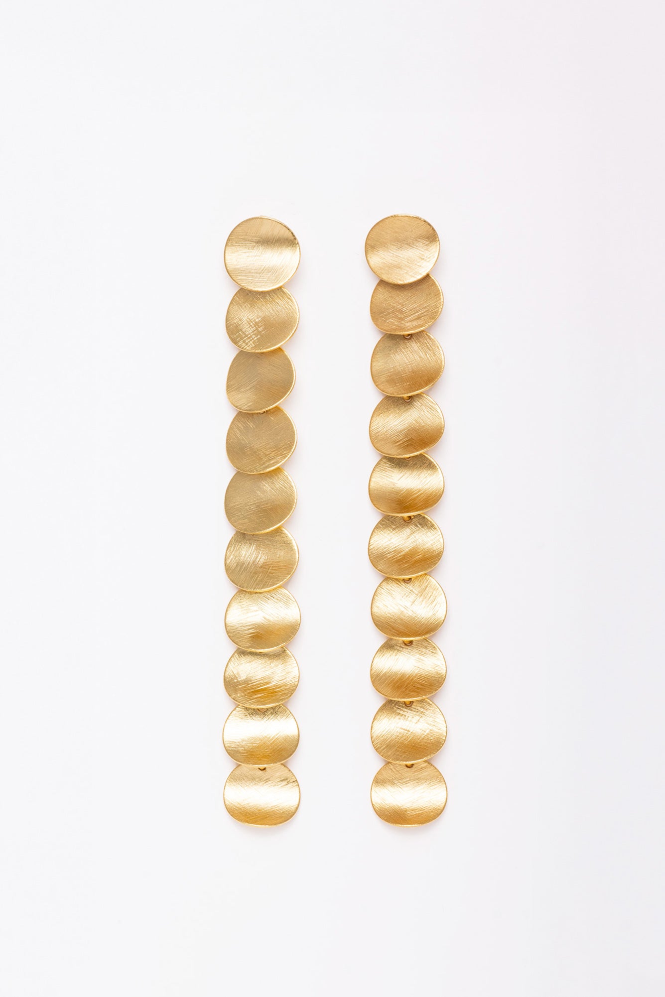 Los Pendientes Lucera son unos pendientes largos compuestos por múltiples círculos del mismo tamaño alineados verticalmente, El acabado es texturizado. El cierre es a presión