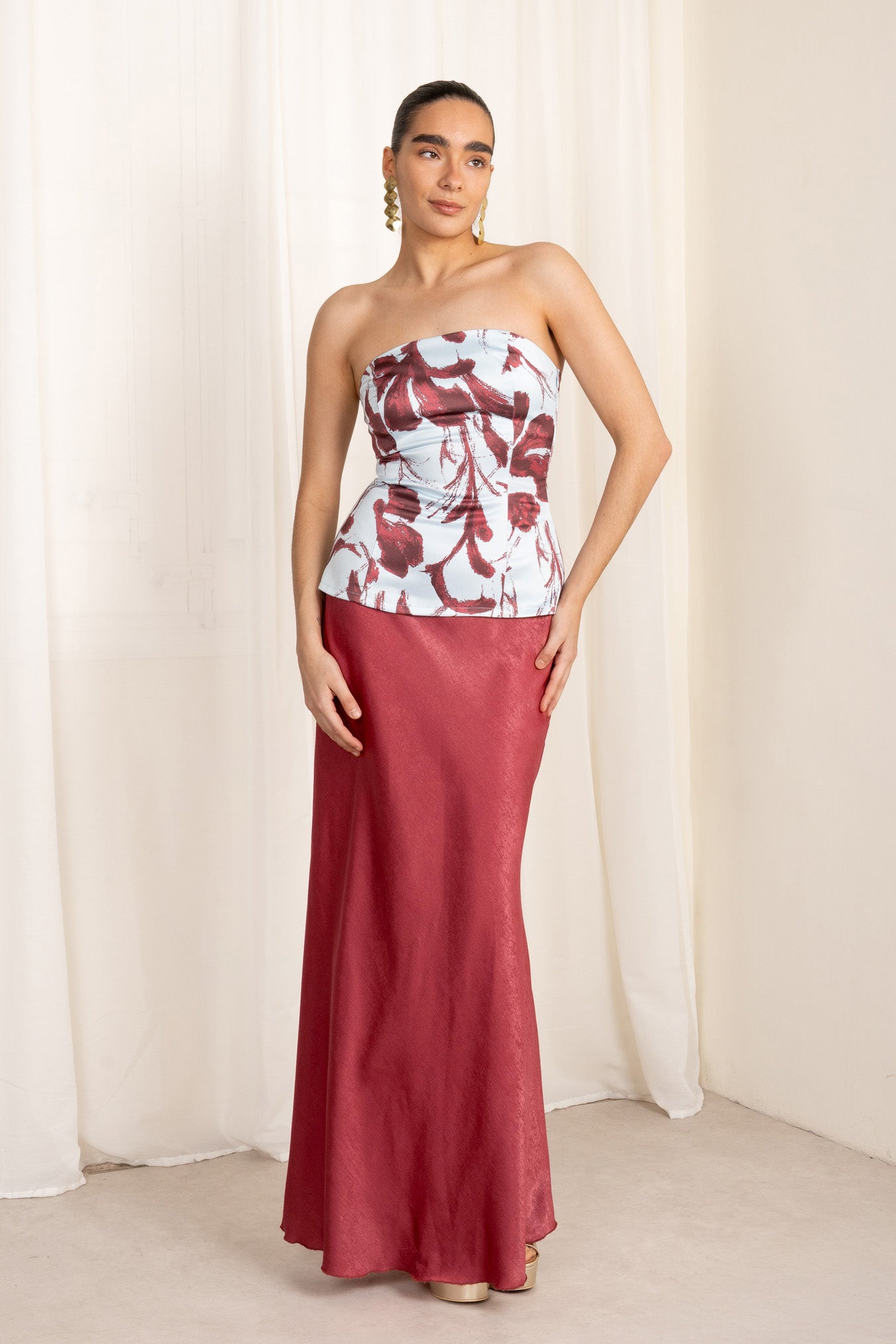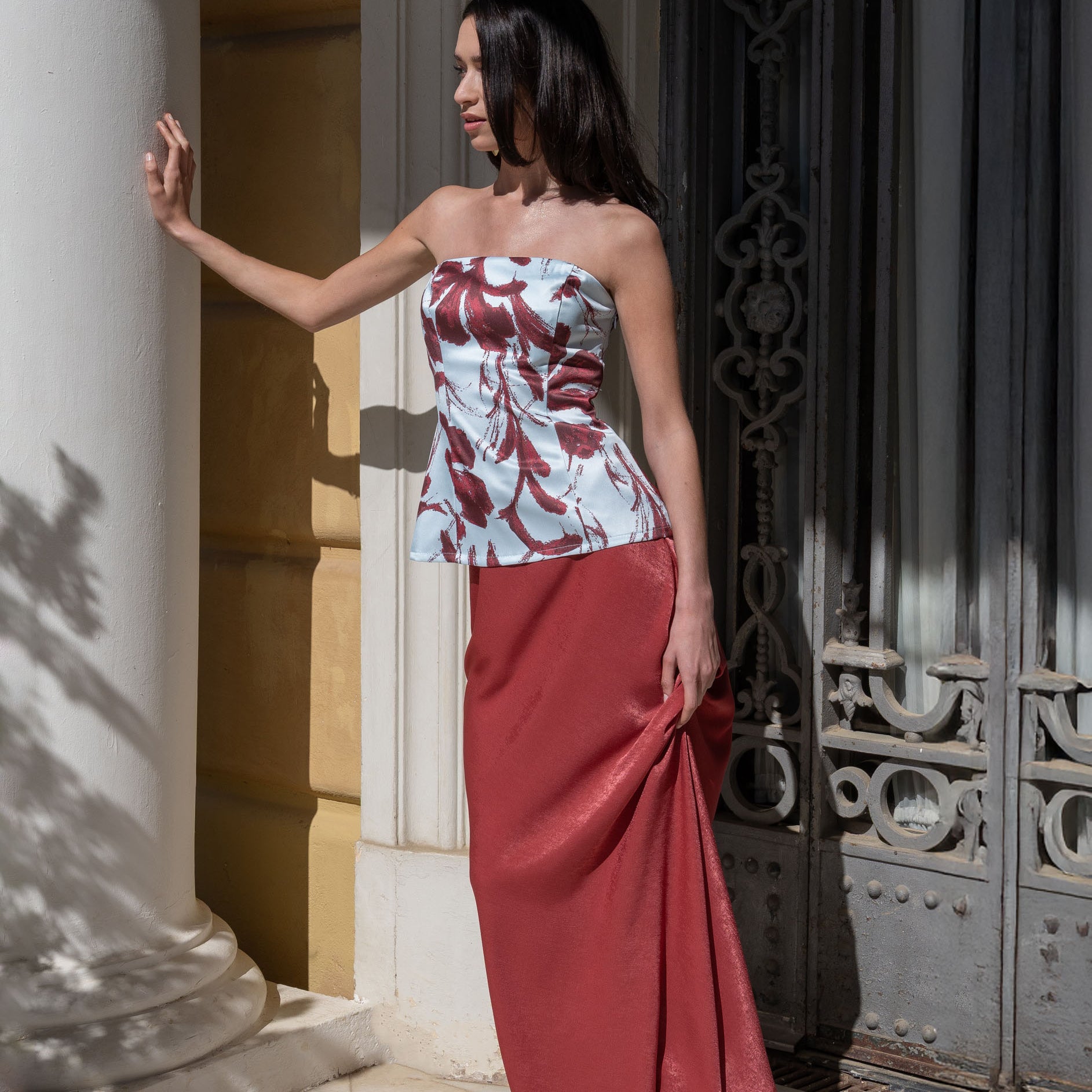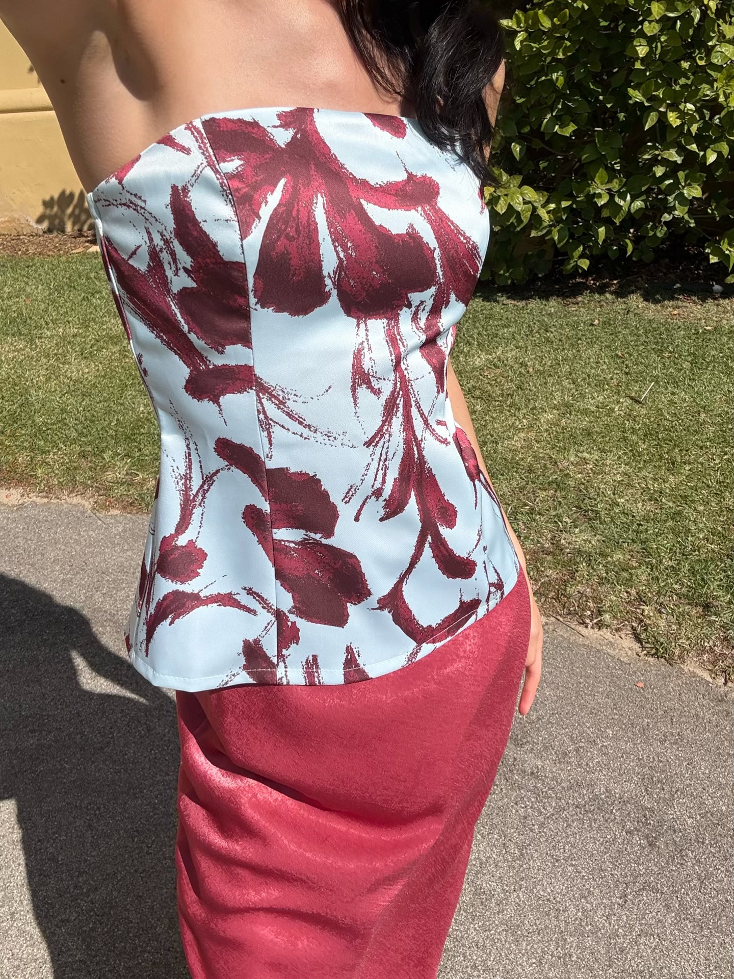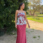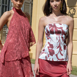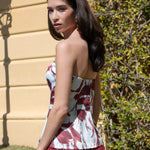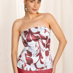 Un diseño de tipo corset que redefine la elegancia con un toque moderno y artístico. Este top de palabra de honor destaca por su estructura entallada que moldea la silueta y su bajo recto, ideal para quienes buscan un look de invitada con personalidad.