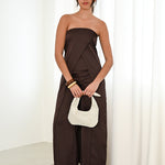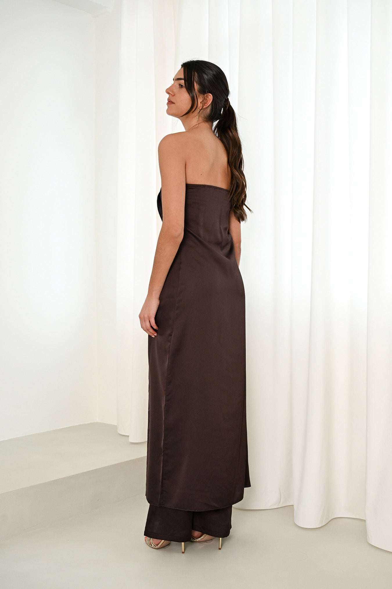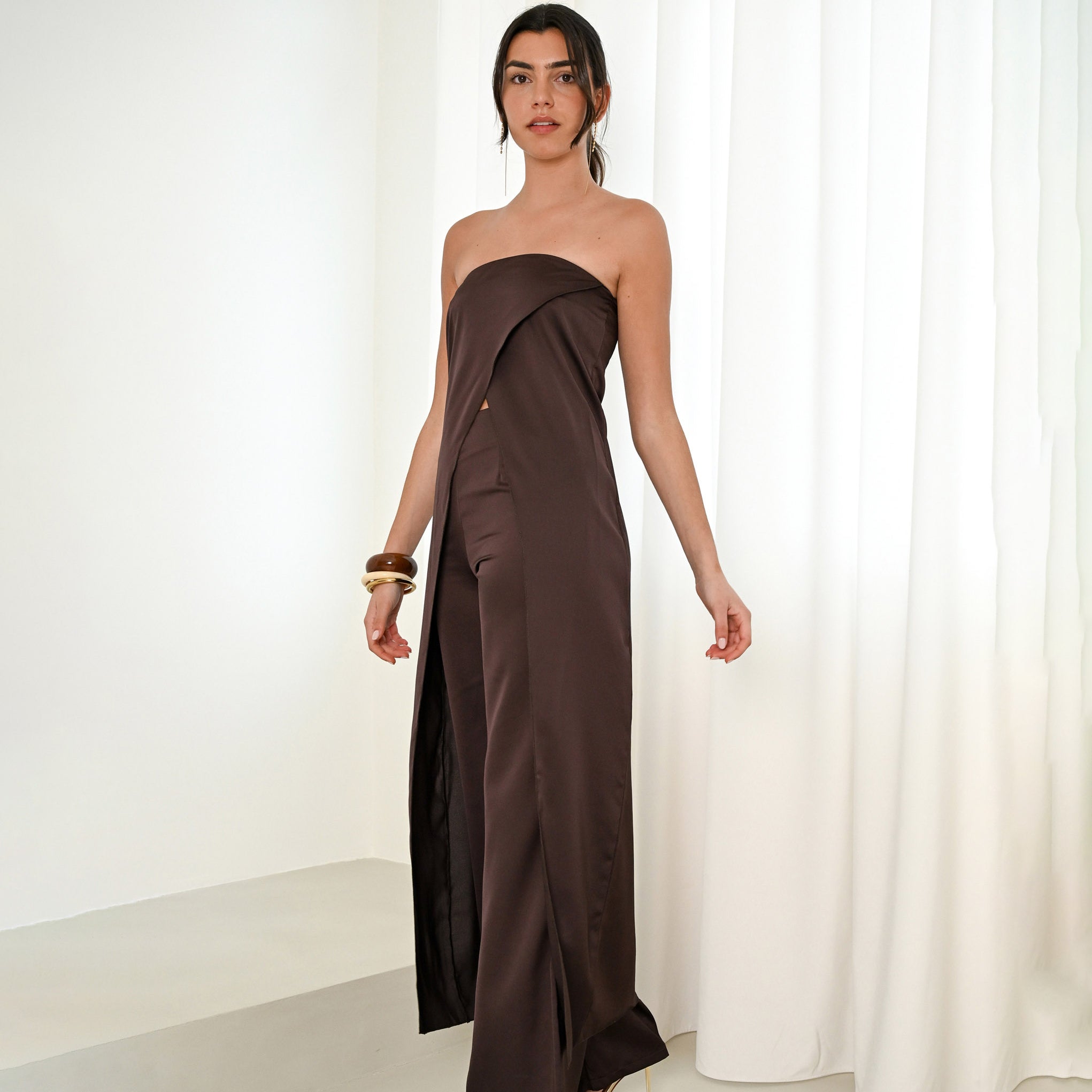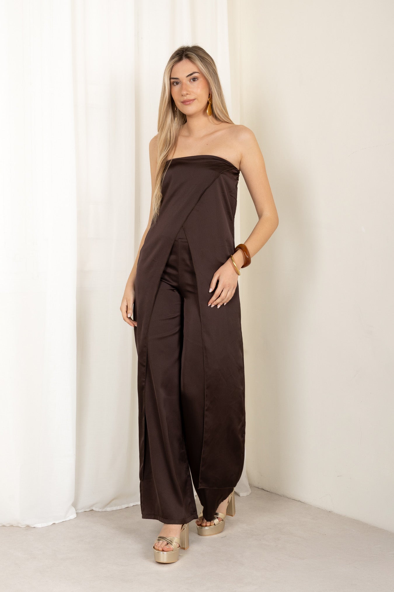 Un maxi top de invitada  o graduada diferente y sofisticado. Su escote palabra de honor y diseño cruzado asimétrico estilizan la figura, mientras la caída fluida aporta movimiento y elegancia. Ideal para combinar con pantalones o faldas y crear un look moderno en bodas, cenas y eventos especiales.