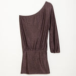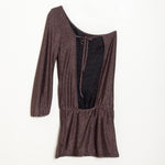 El clásico vestido de noche se reinterpreta en esta versión elegante y especial. Su escote asimétrico y su tejido cobre brillante hacen de esta prenda un imprescindible en cualquier armario. La espalda abierta con lazada aporta ese detalle delicado que marca la diferencia.