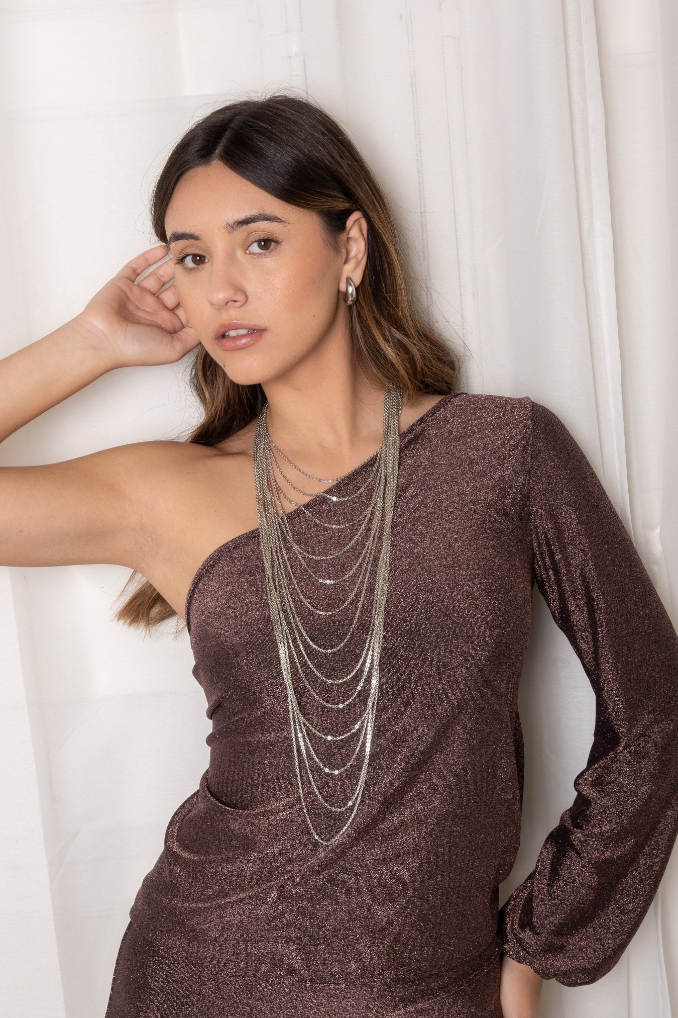 El clásico vestido de noche se reinterpreta en esta versión elegante y especial. Su escote asimétrico y su tejido cobre brillante hacen de esta prenda un imprescindible en cualquier armario. La espalda abierta con lazada aporta ese detalle delicado que marca la diferencia.