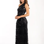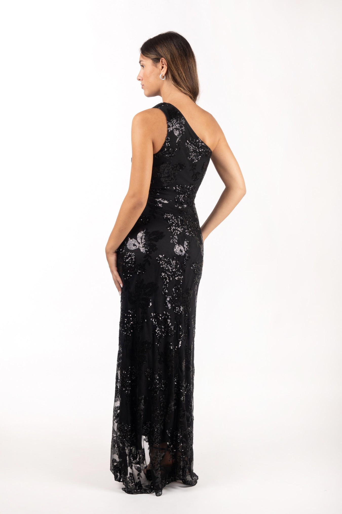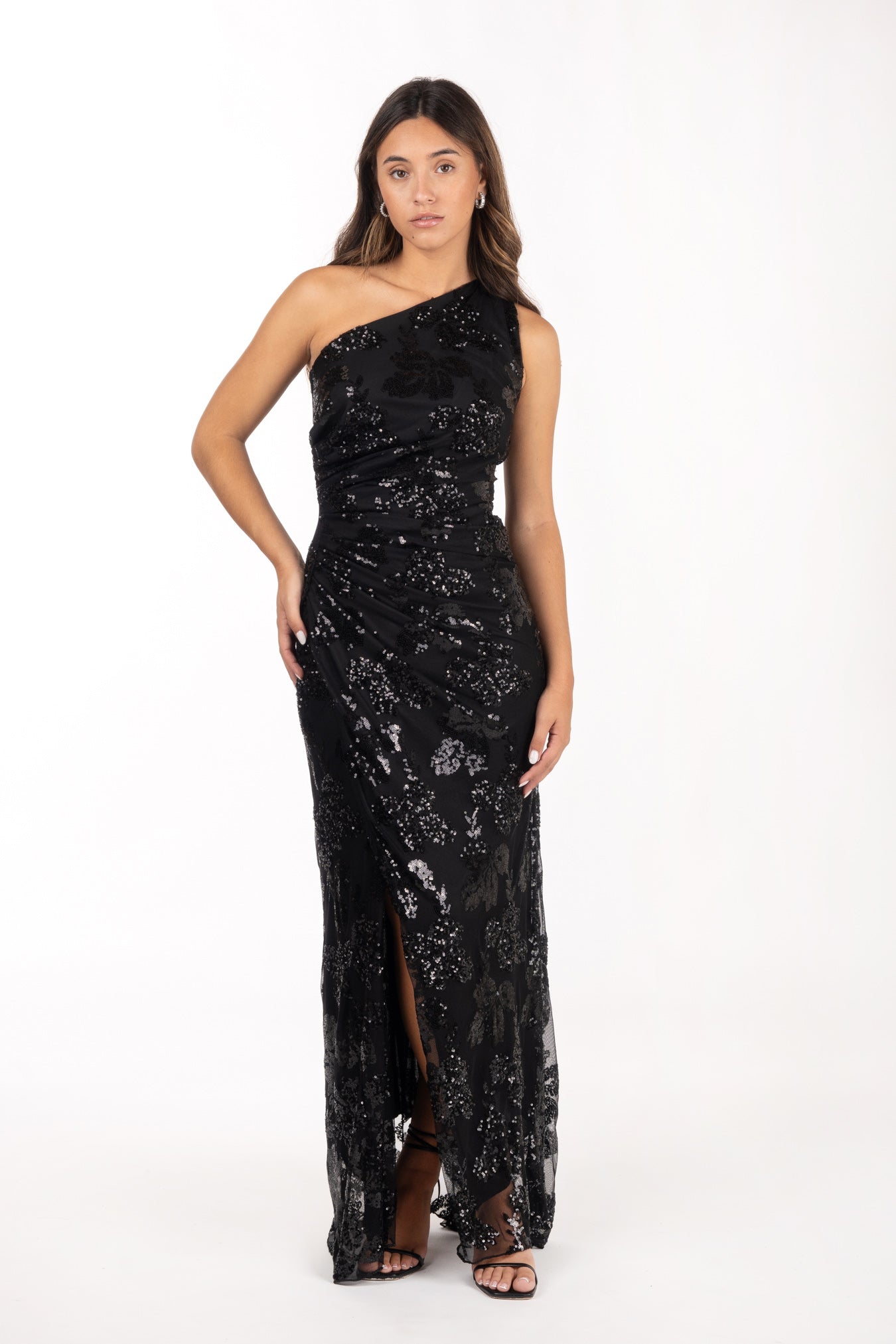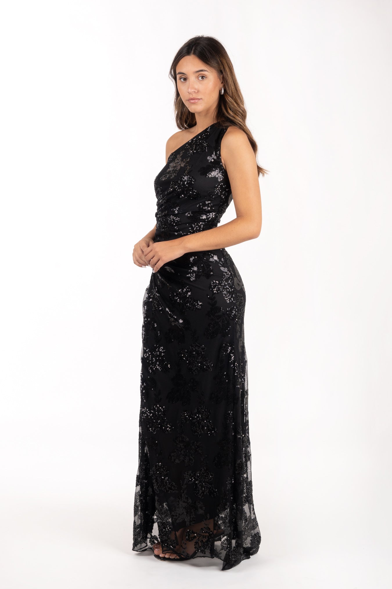 Su escote asimétrico realza los hombros con un toque moderno, mientras que el fruncido lateral estiliza la silueta de forma natural.