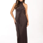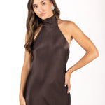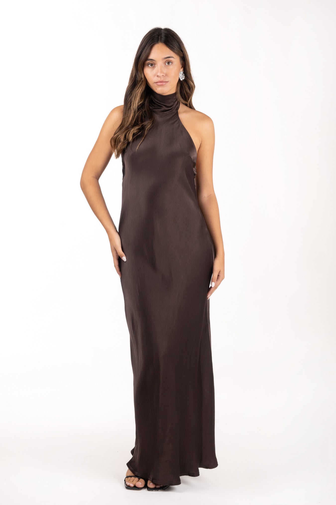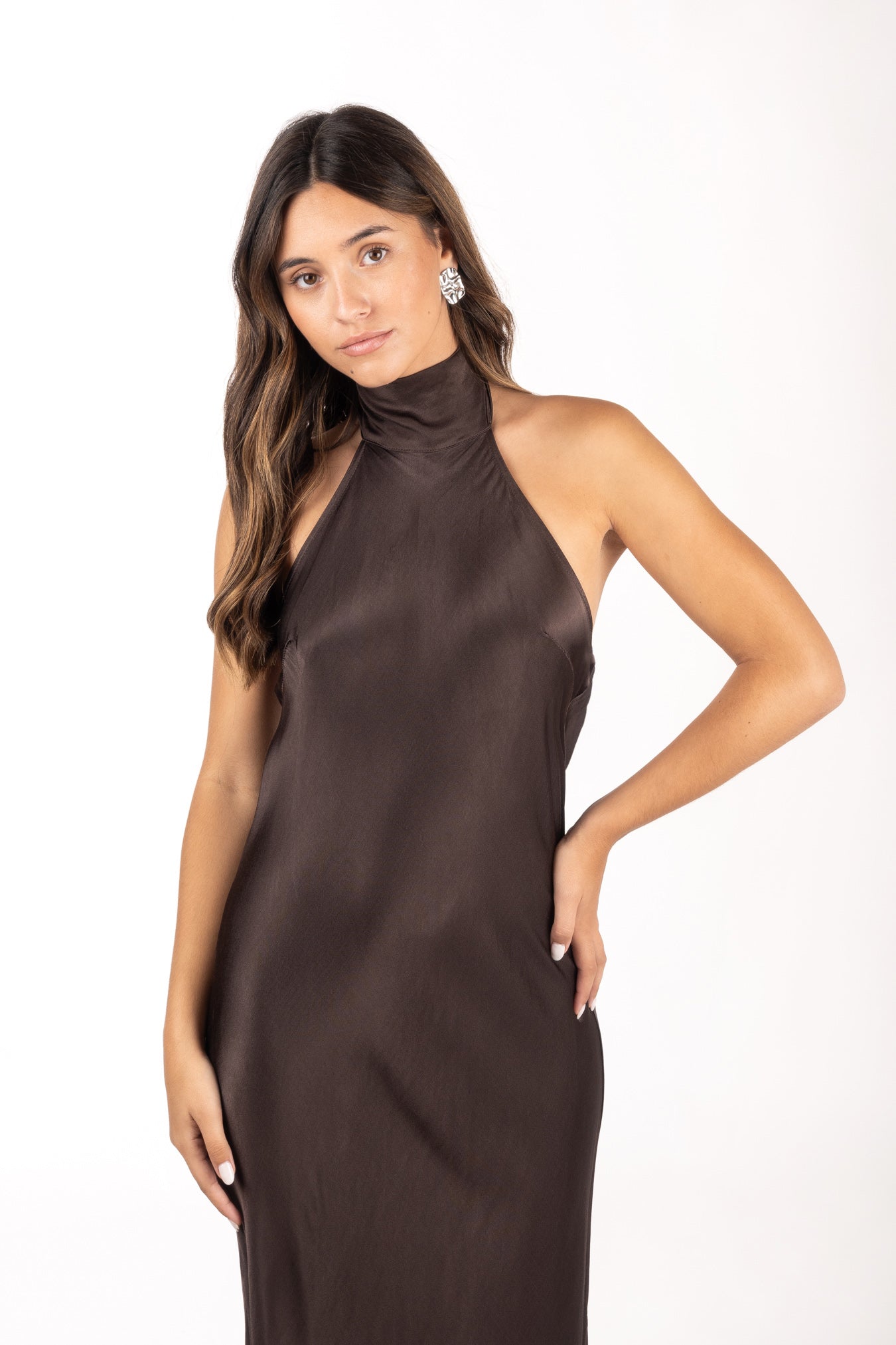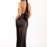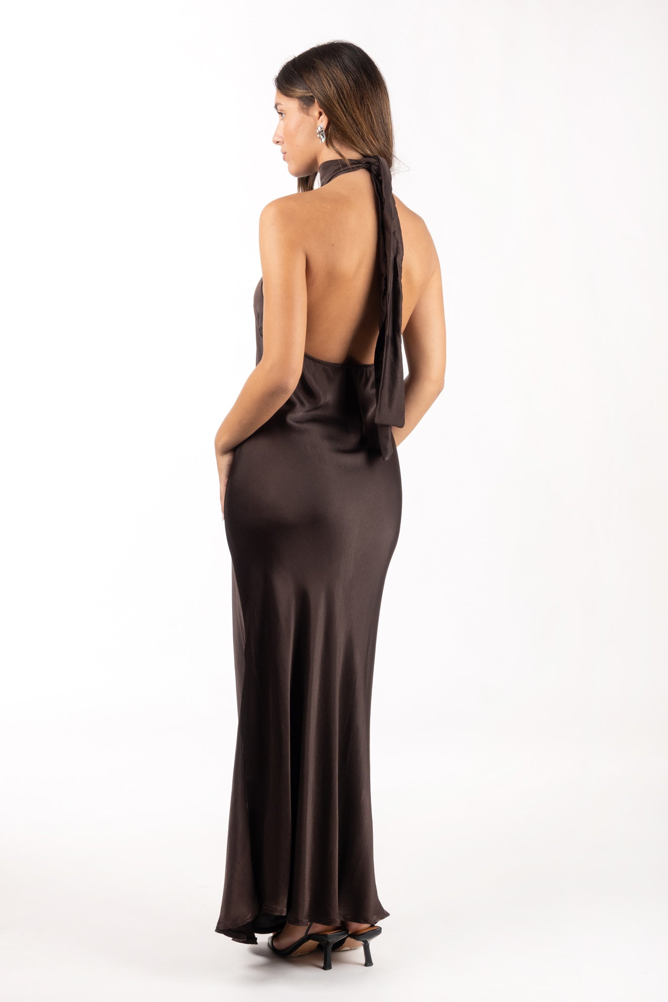 El vestido Gina Marrón, es ideal para bodas, cenas de gala o eventos de noche, su escote alto atado al cuello y espalda descubierta, combinan elegancia y sensualidad en una misma prenda.