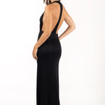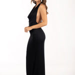 Vestido largo negro en lurex con escote drapeado y espalda descubierta.