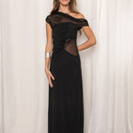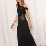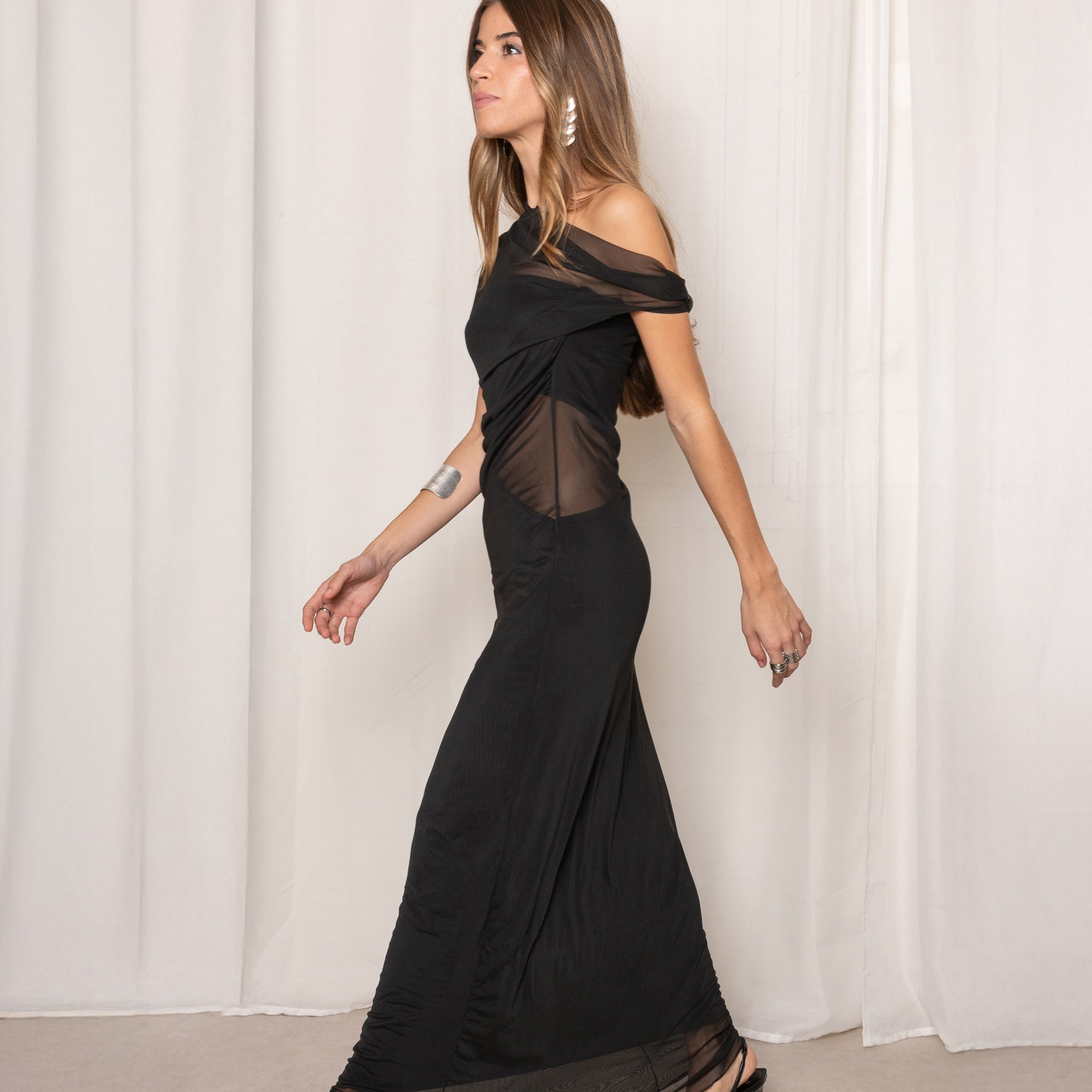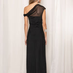 Vestido largo asimétrico con transparencias en tul que fusiona la elegancia clásica con un toque atrevido. Su corte de un solo hombro realza la silueta y aporta ese giro sofisticado que convierte este diseño en el protagonista absoluto de cualquier evento de noche, ya sea una boda, una fiesta o una cita muy especial.