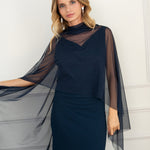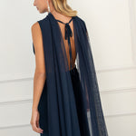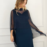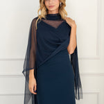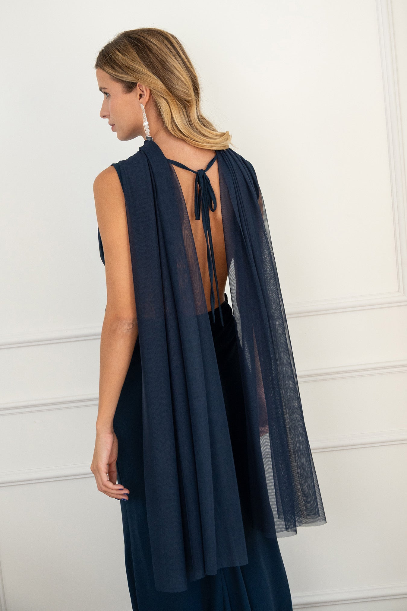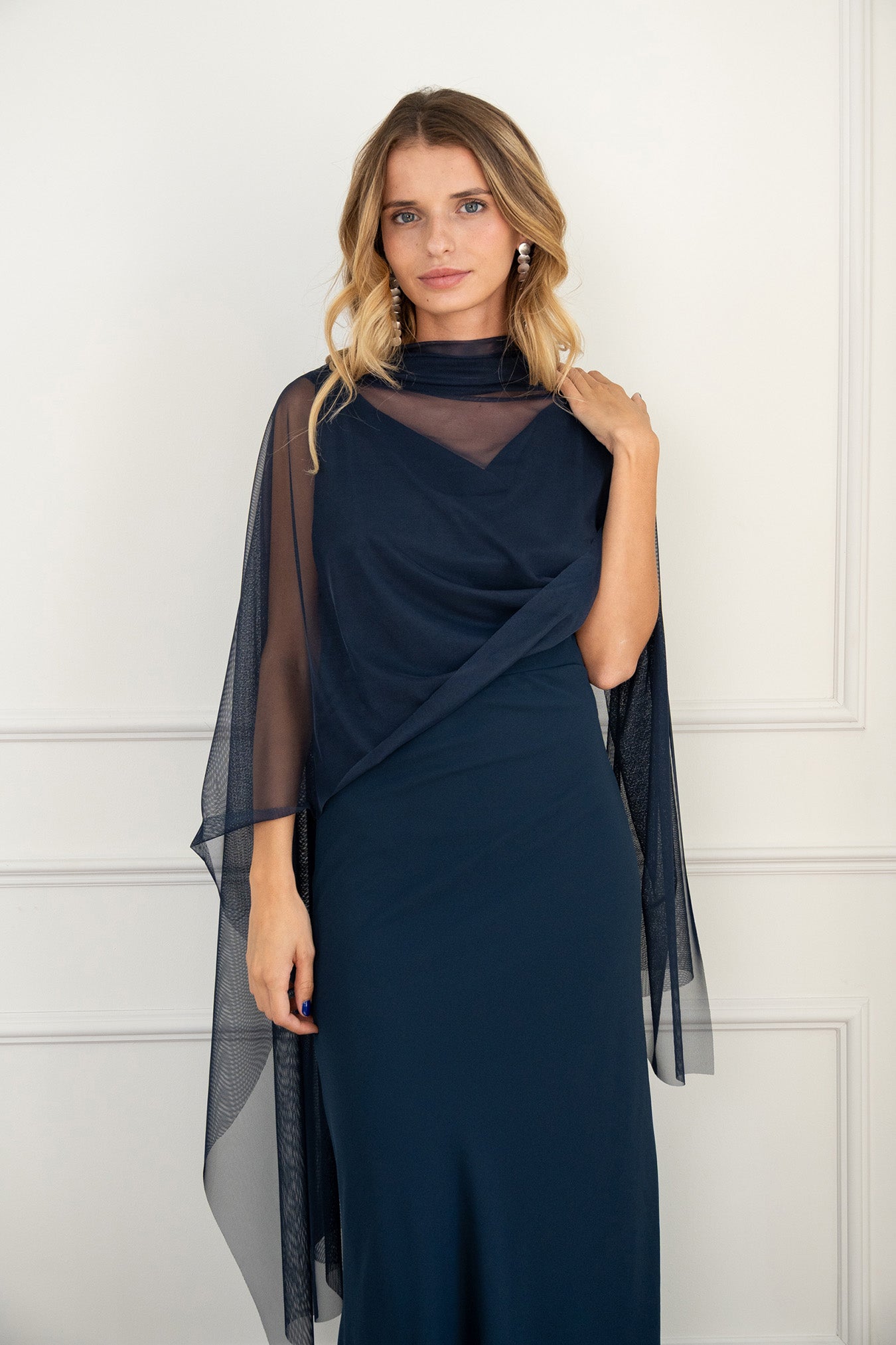 El Cathe Chal Azul Noche es un accesorio elegante y sofisticado, ideal para eventos especiales. Confeccionado en tulle semi-transparente, su color azul profundo aporta un toque chic y único a tu look.
