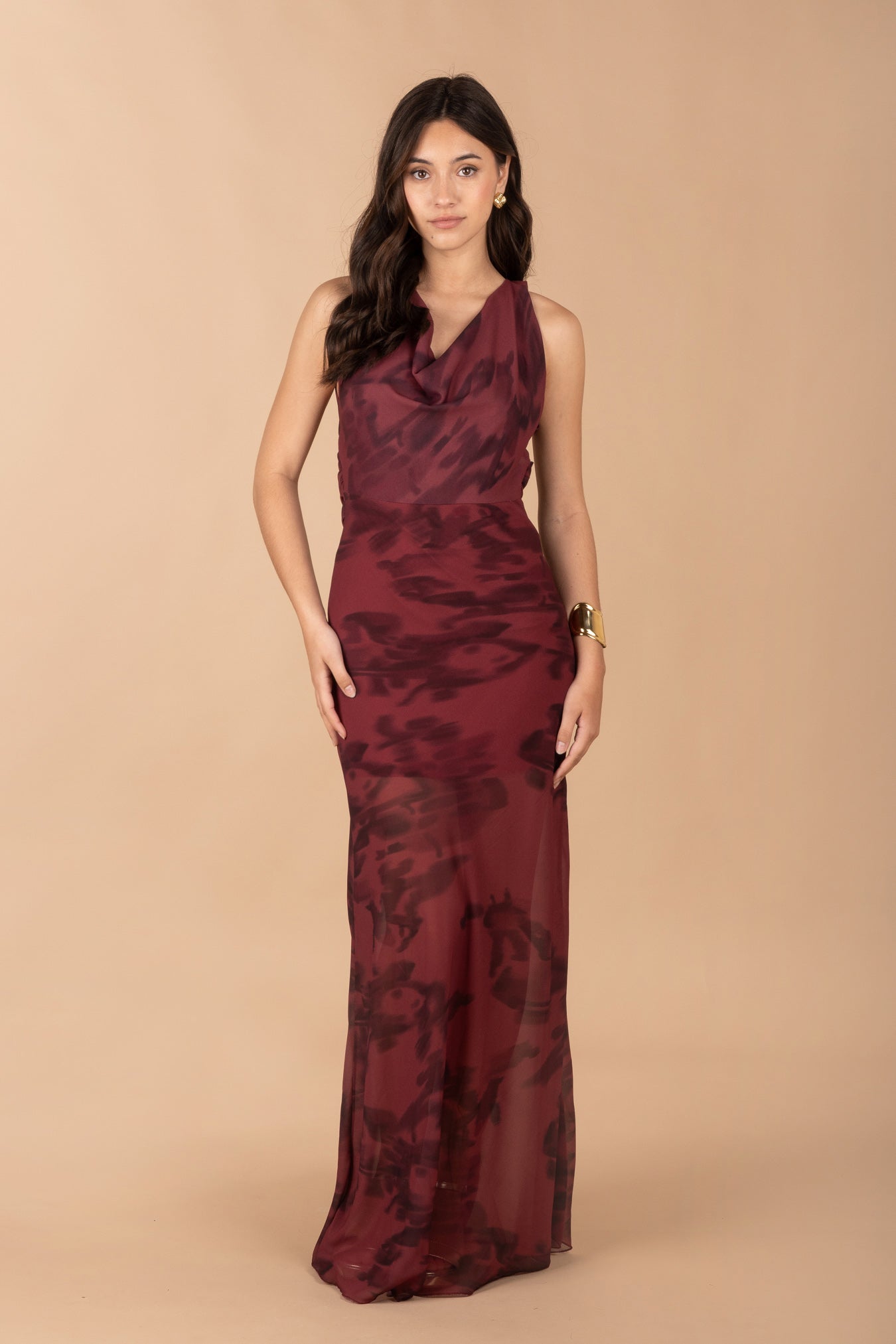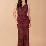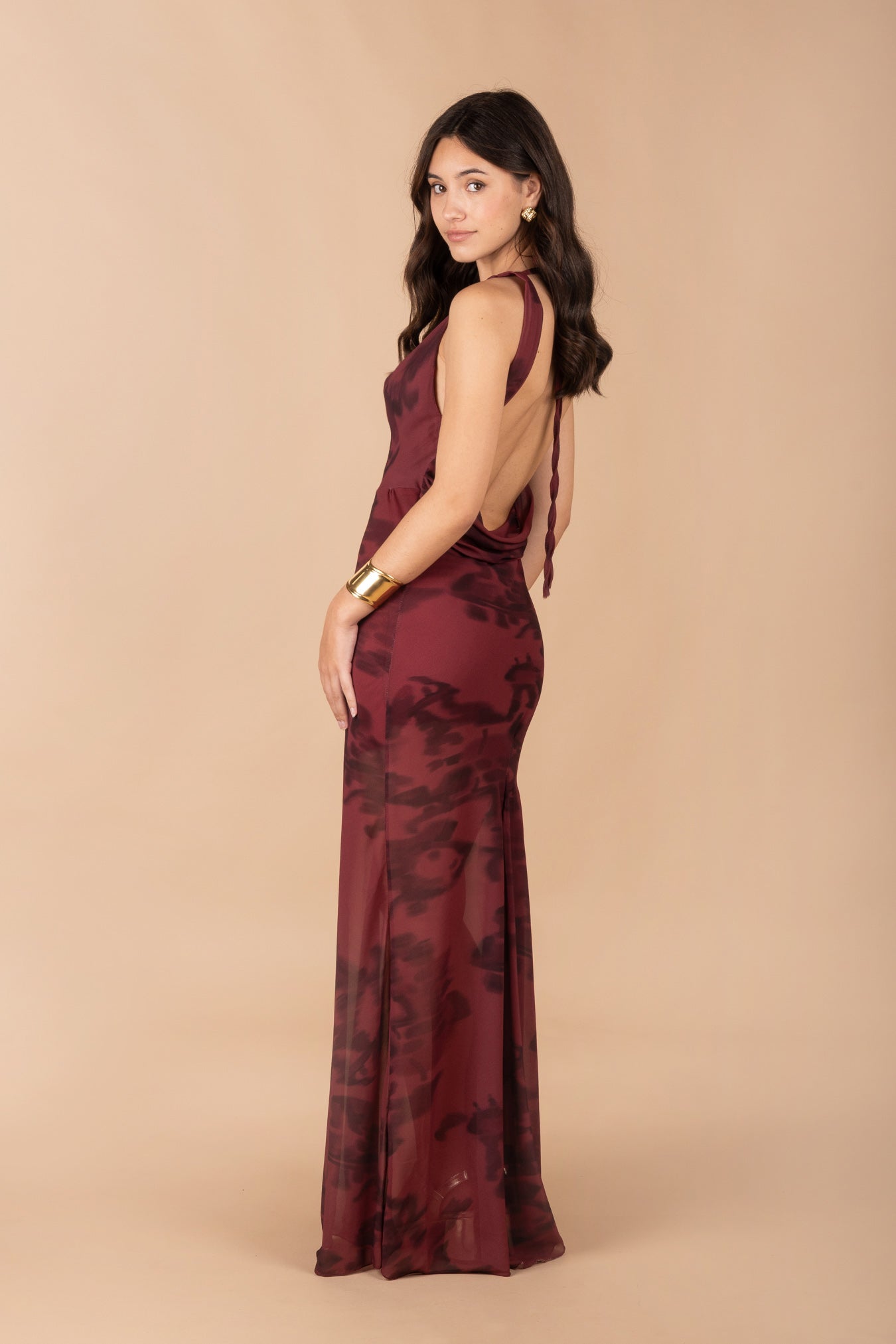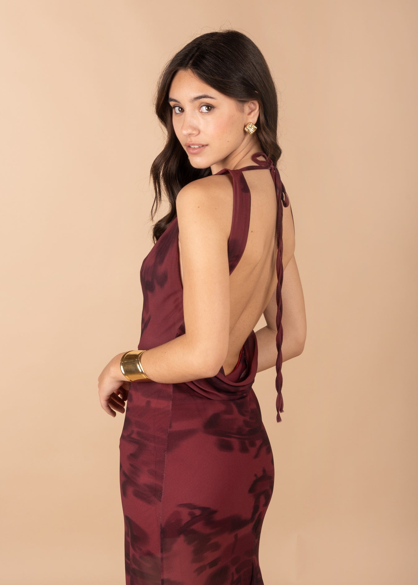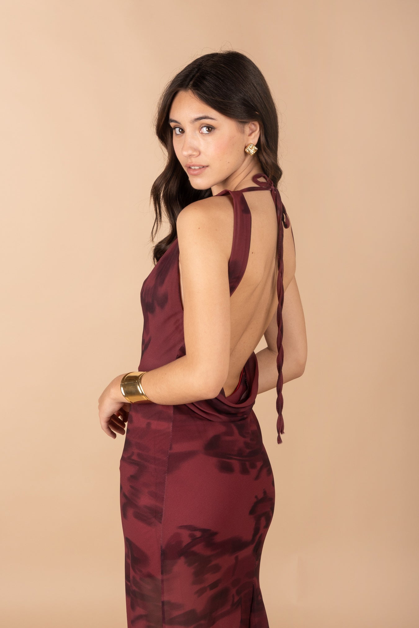 Vestido largo de silueta fluida con escote drapeado y estampado en tonos granate. Su tejido en gasa realza la figura con elegancia, ideal para invitadas, eventos de verano o celebraciones al aire libre.
