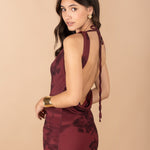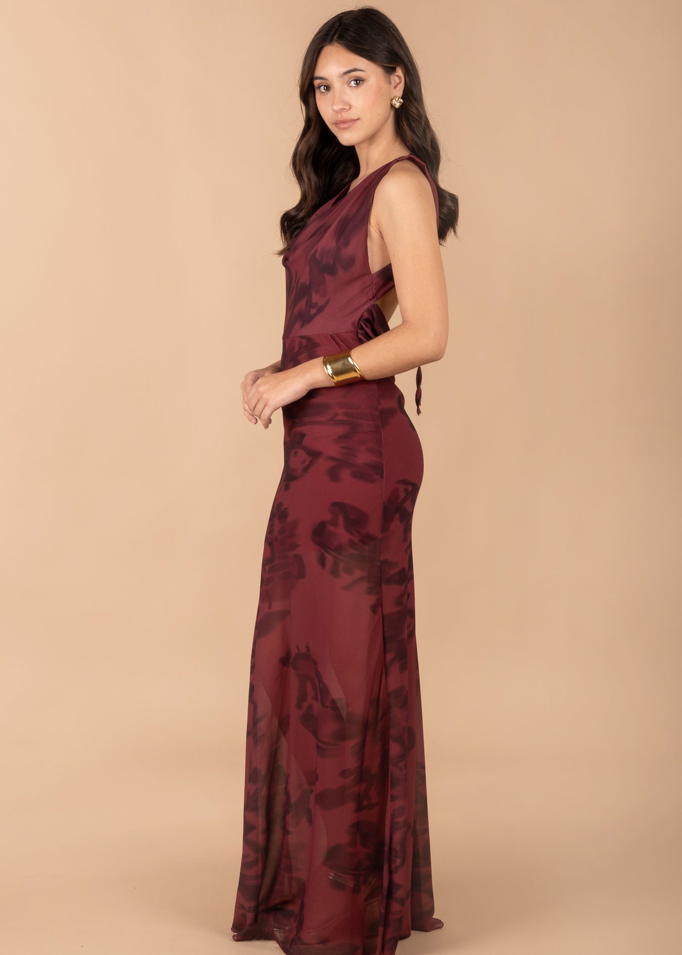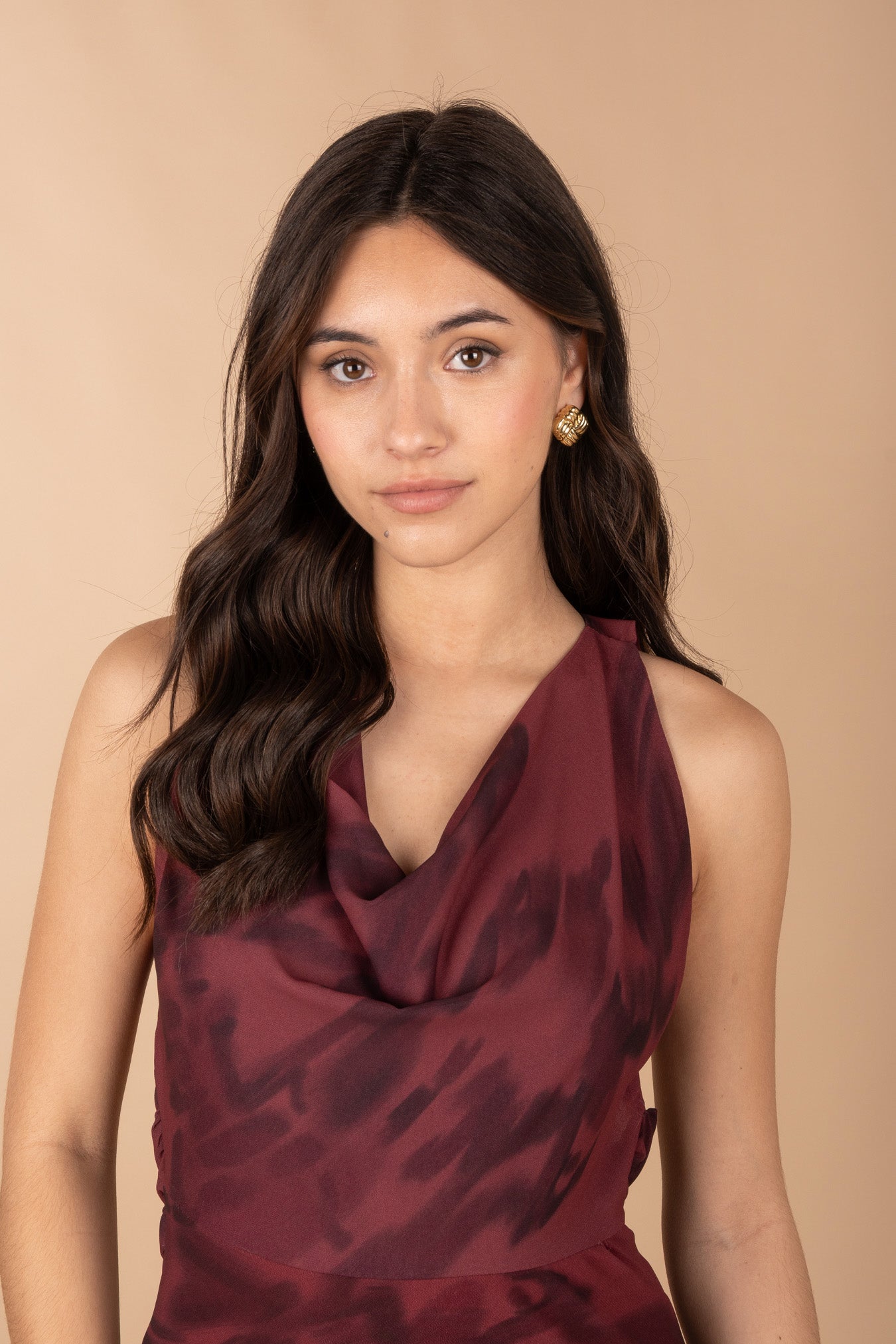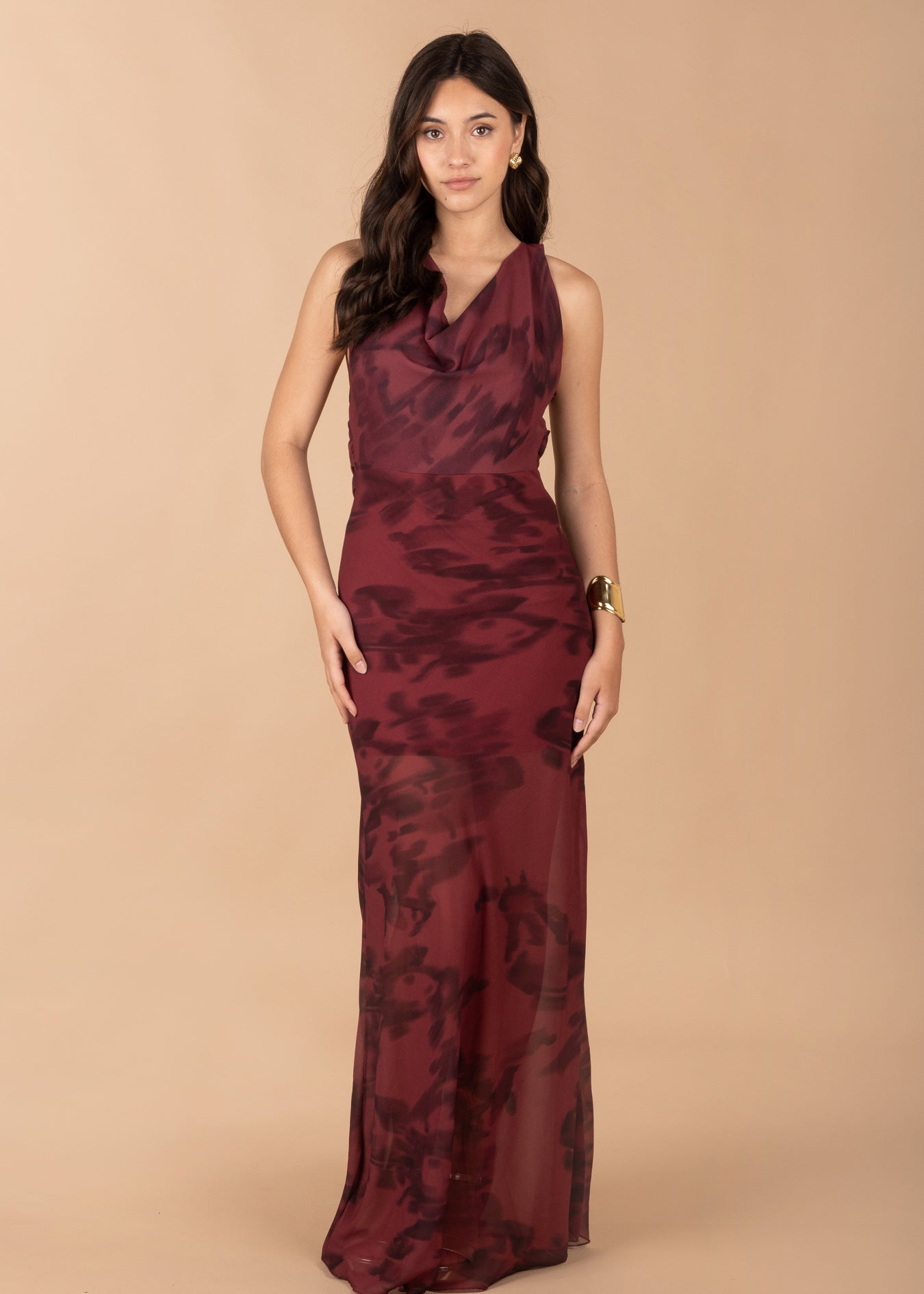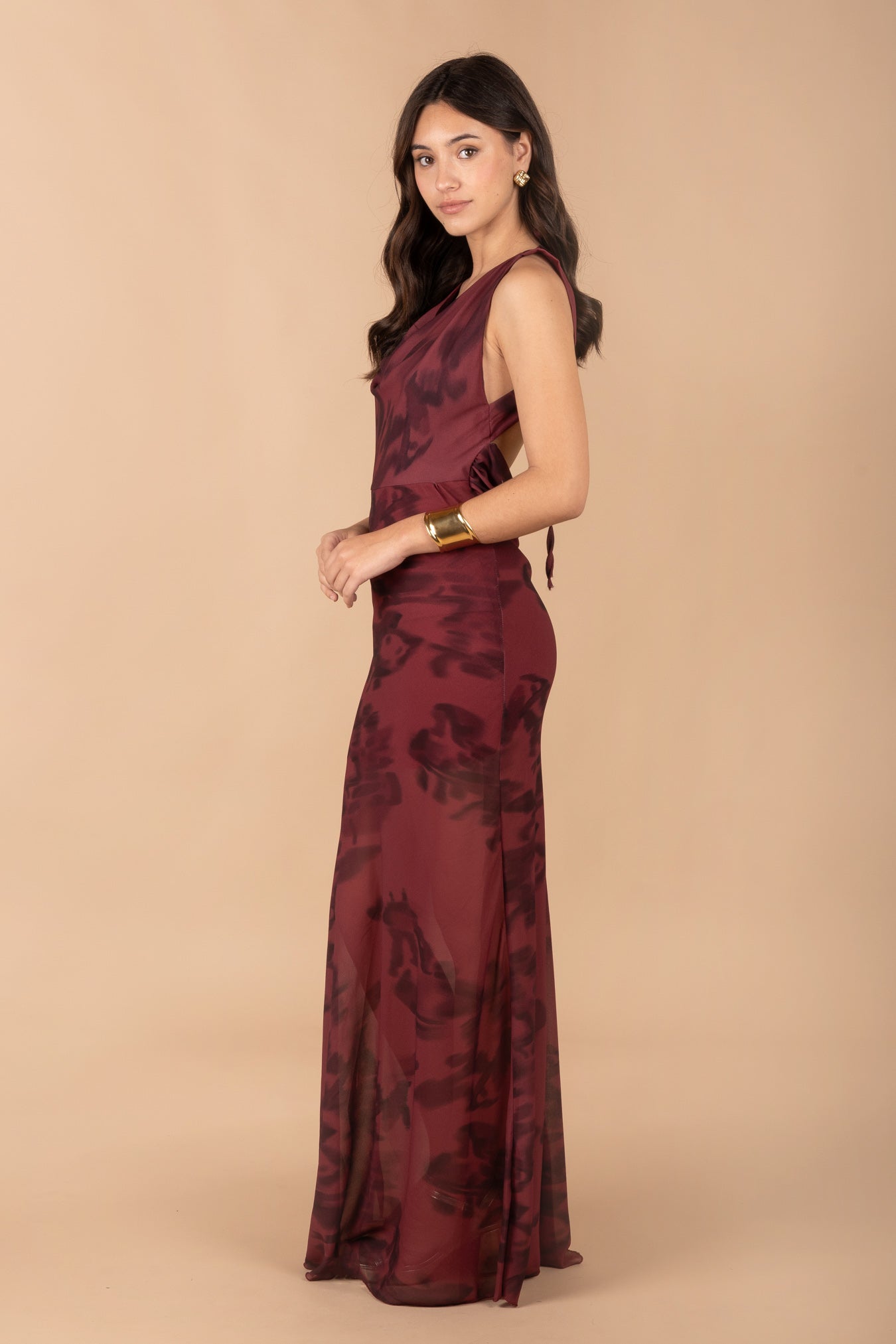 Vestido largo de silueta fluida con escote drapeado y estampado en tonos granate. Su tejido en gasa realza la figura con elegancia, ideal para invitadas, eventos de verano o celebraciones al aire libre.
