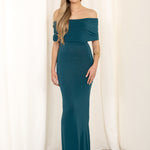 Su escote bardot con drapeado realza los hombros, mientras la espalda cruzada descubierta añade un toque elegante. El tejido elástico se adapta al cuerpo con una caída fluida que estiliza.