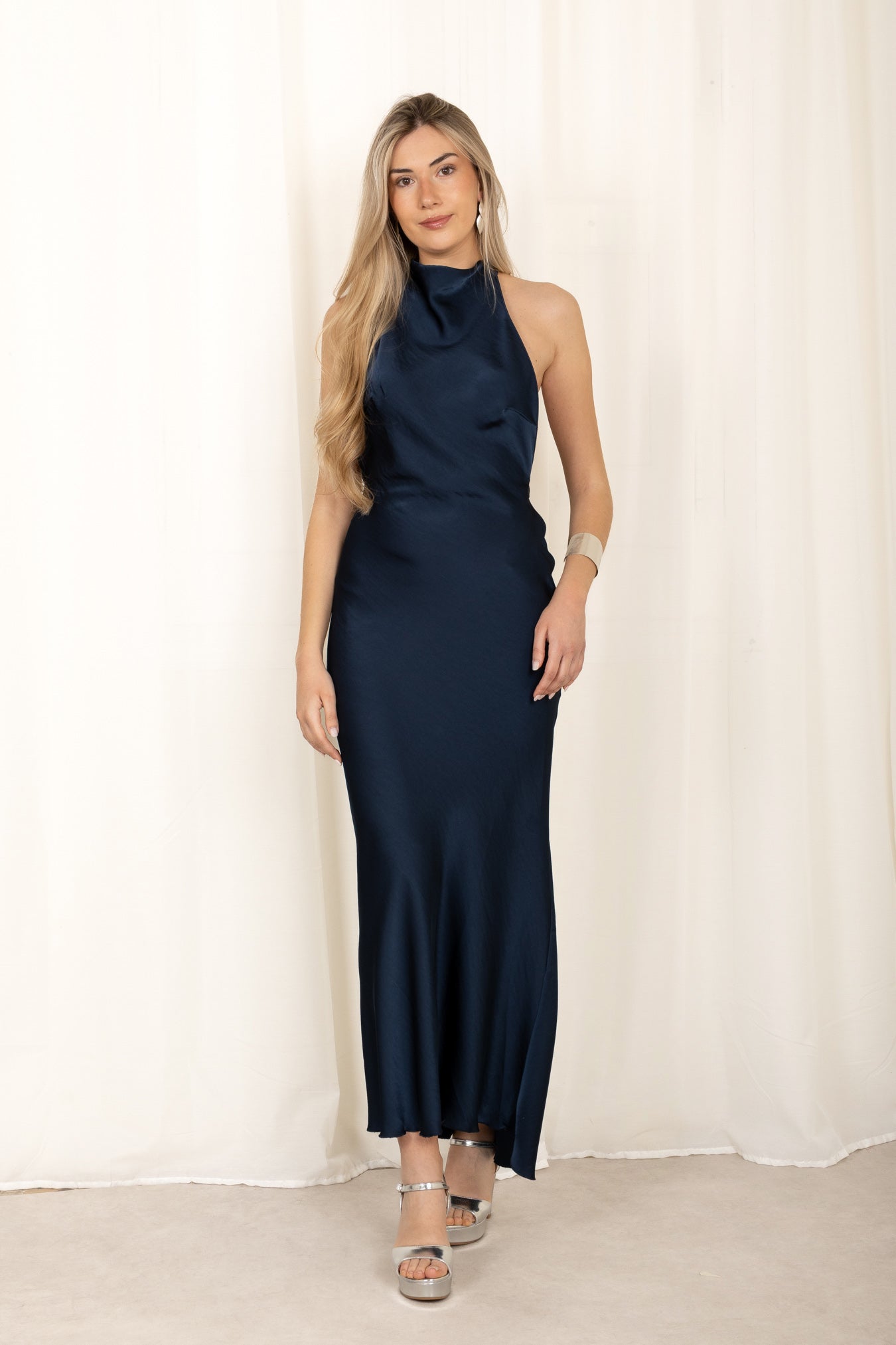 Con escote halter, espalda descubierta y un diseño fluido, estiliza muchísimo y sienta increíble. Tiene una caída bonita que marca silueta sin quedar ajustado, así que es perfecto para graduaciones, bodas de día y eventos de verano.