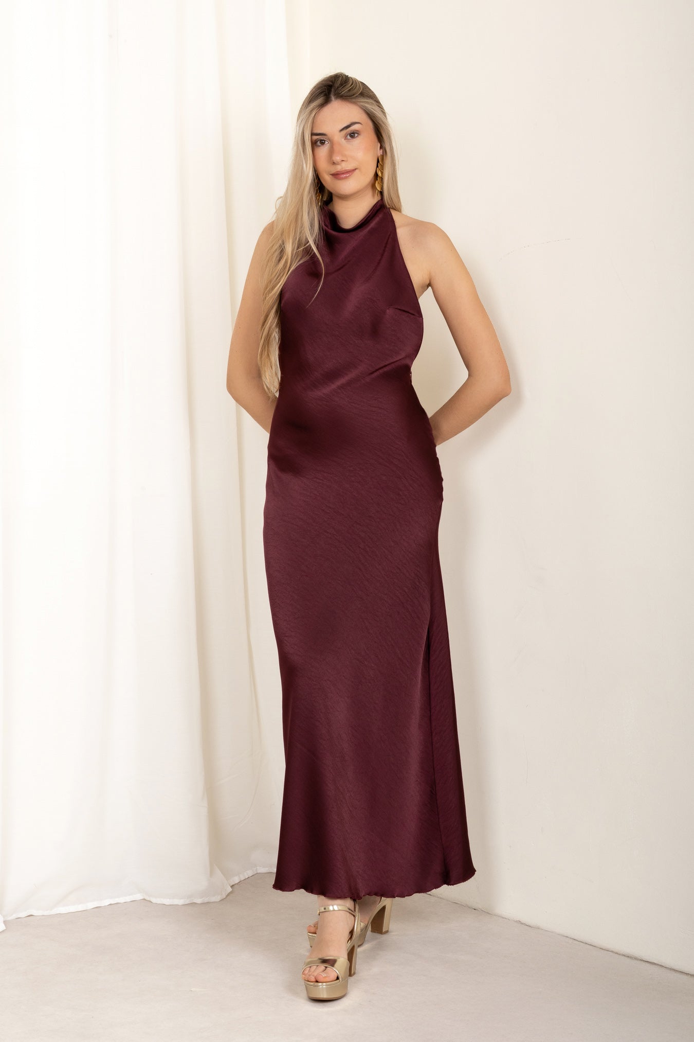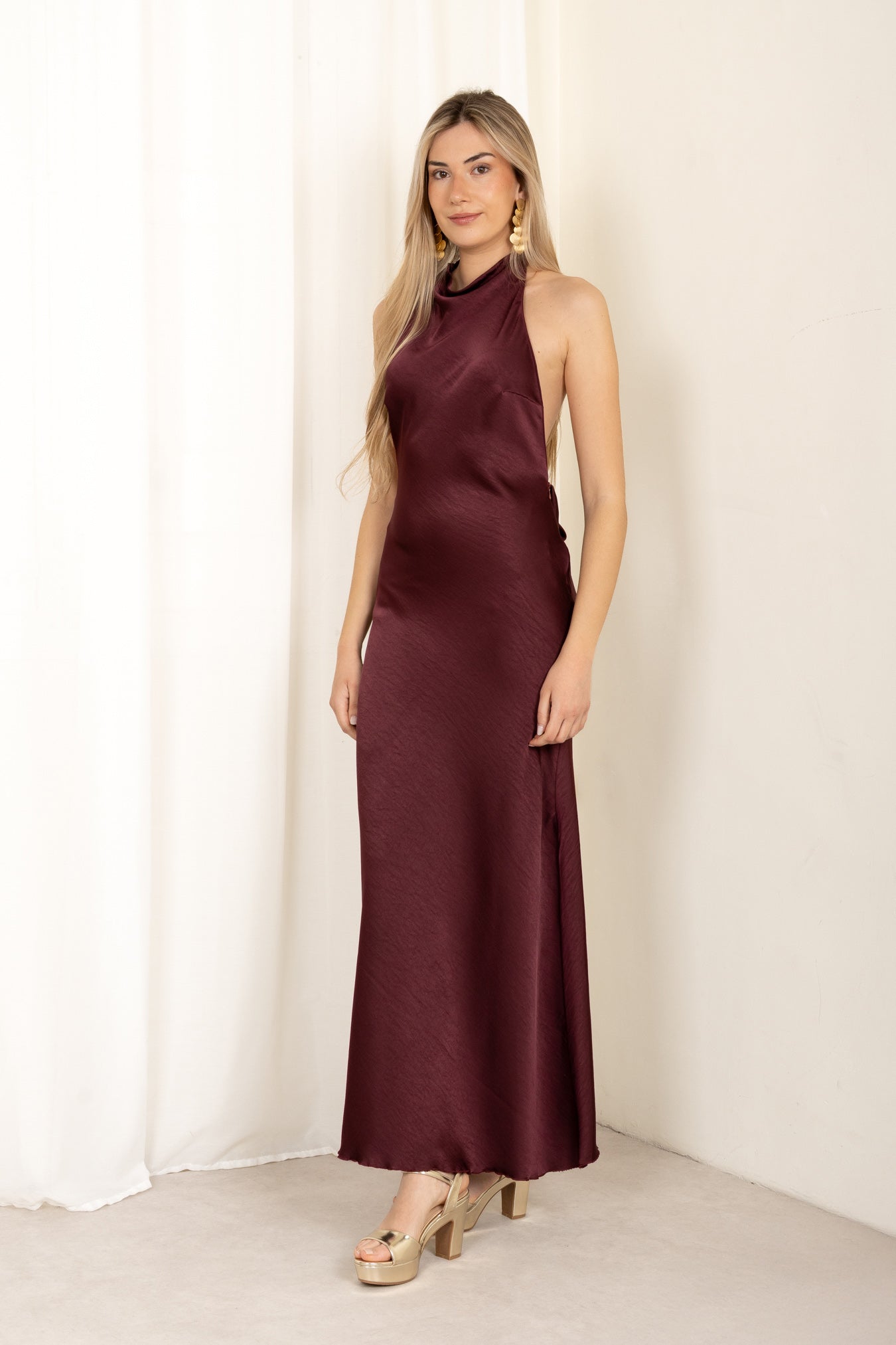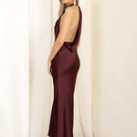 Modelo con vestido largo marrón Icon con escote halter y espalda descubierta, vista frontal.