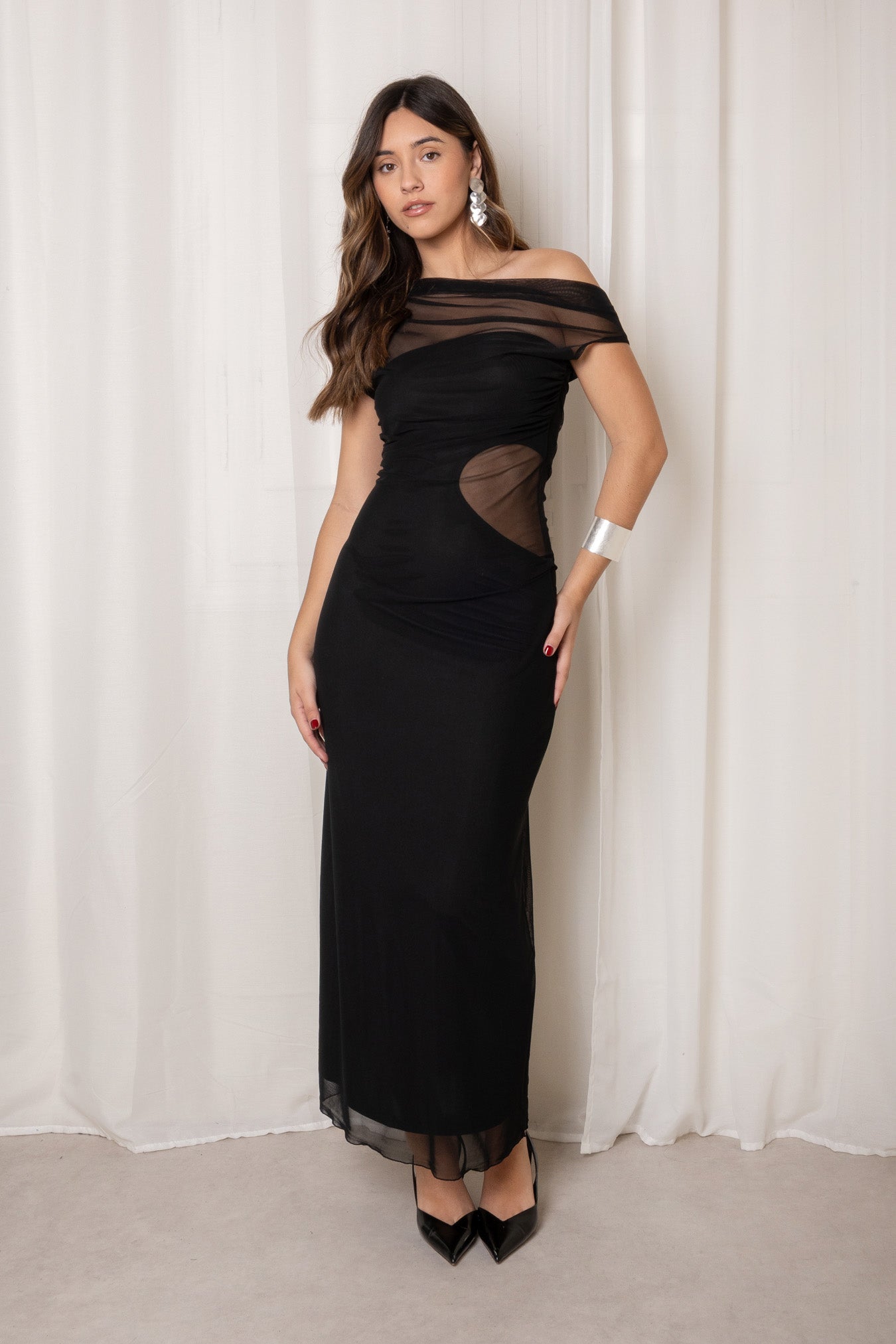 Vestido largo asimétrico con transparencias en tul que fusiona la elegancia clásica con un toque atrevido. Su corte de un solo hombro realza la silueta y aporta ese giro sofisticado que convierte este diseño en el protagonista absoluto de cualquier evento de noche, ya sea una boda, una fiesta o una cita muy especial.