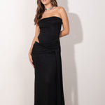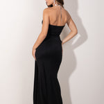 Vestido largo palabra de honor con cut-out lateral y lazada en la cadera.
