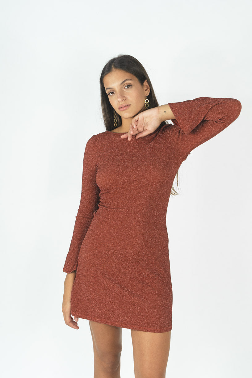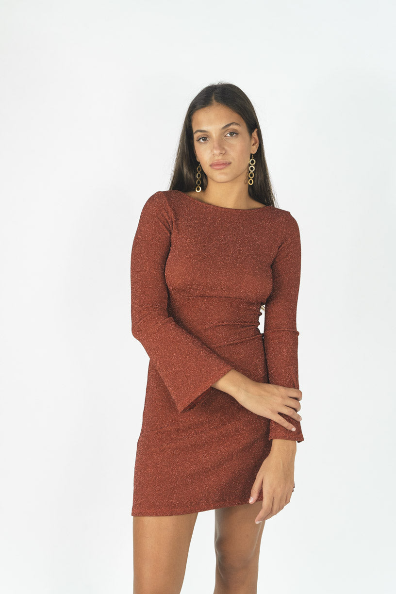 Vestido corto confeccionado con lurex. Escote en espalda atado con un lazo. Mangas acampanadas.